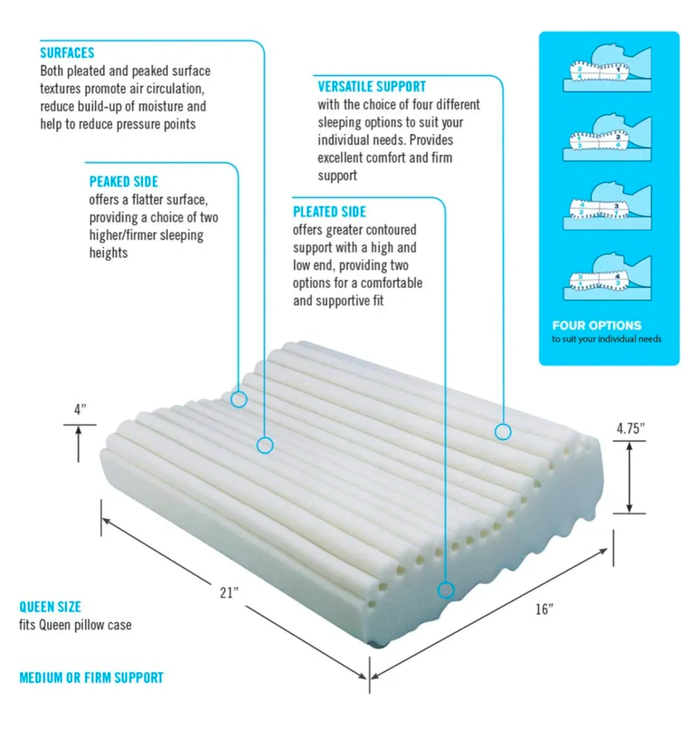 * Pleated and Peaked Surfaces: Promotes air circulation, reduces moisture, and reduces pressure points