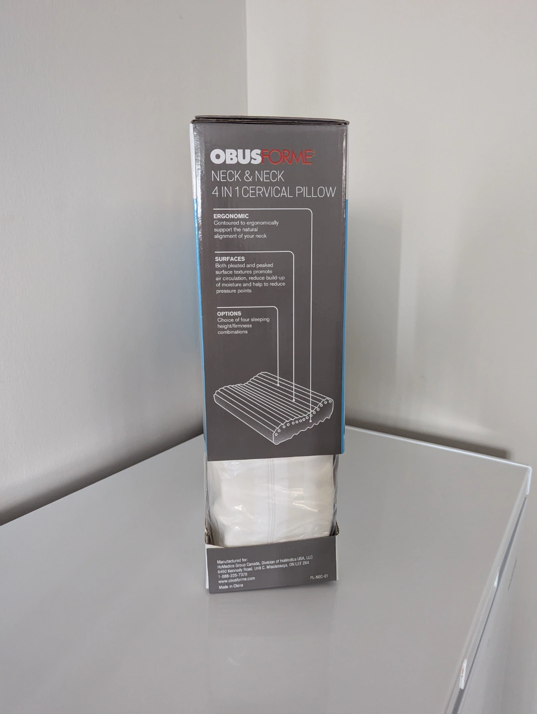 This is a brand new ObusForme Cervical Neck Pillow designed with unique support features for a restful night's sleep. This pillow has never been used and is still in its original packaging. The pillow offers four different sleeping options to suit your individual needs.