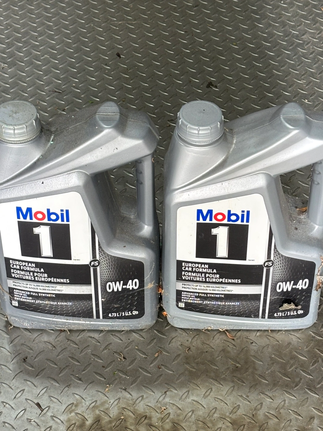 Two 4.73 litre jugs of Mobil 1 European Car Formula 0W-40 engine oil. Advanced full synthetic motor oil. Protects up to 16,000 kilometres.