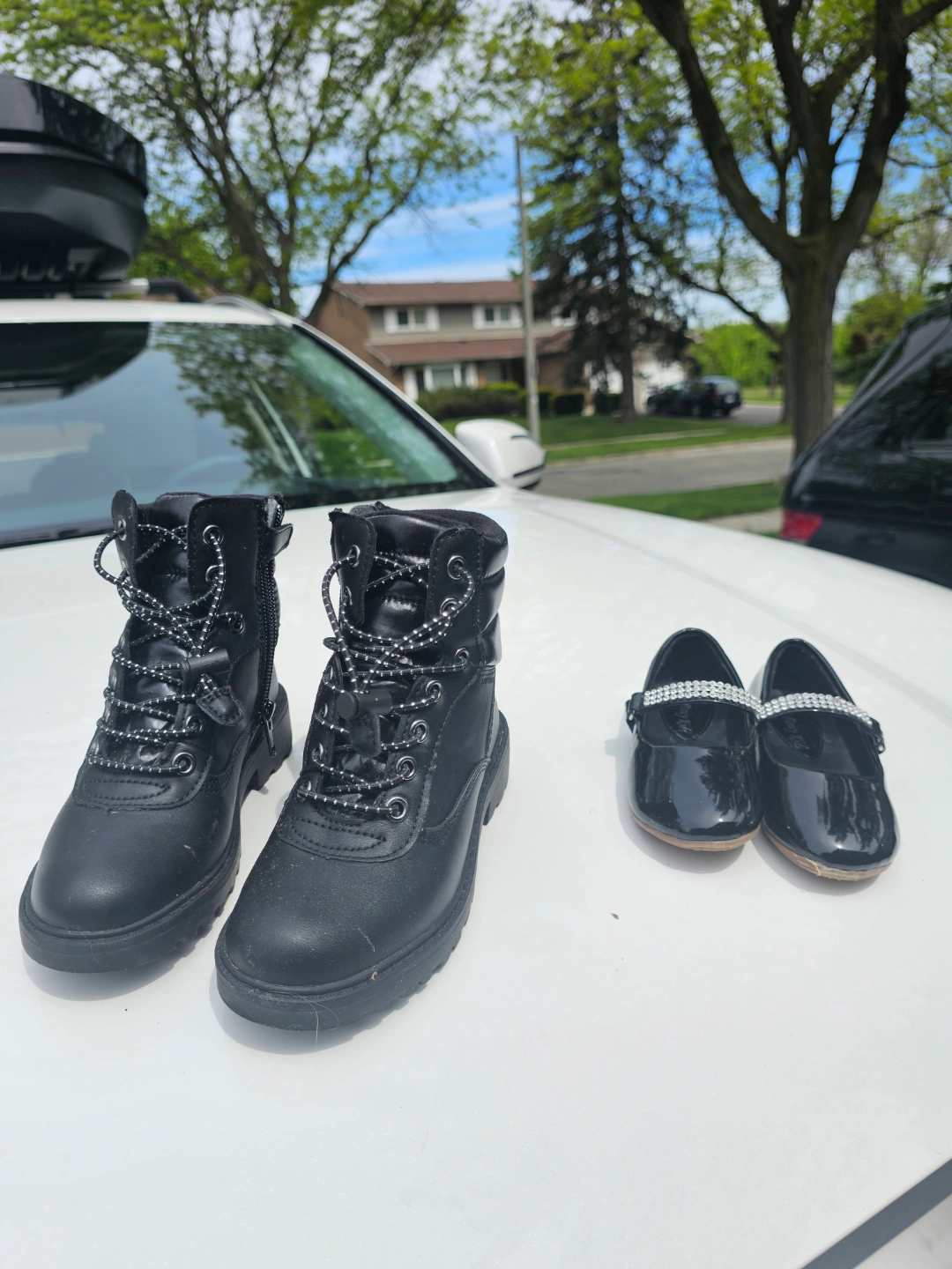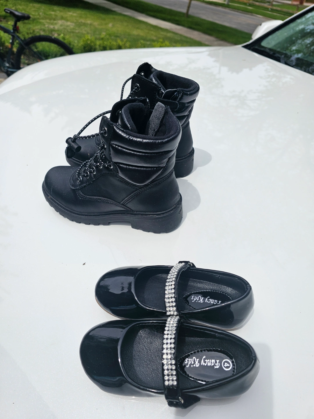 Pair of black Geox boots. Lace-up style with padded collar. Size 11.5. Also, a pair of black patent leather shoes size 4 toddler. Rhinestone detail across the straps. Both gently used for one day.