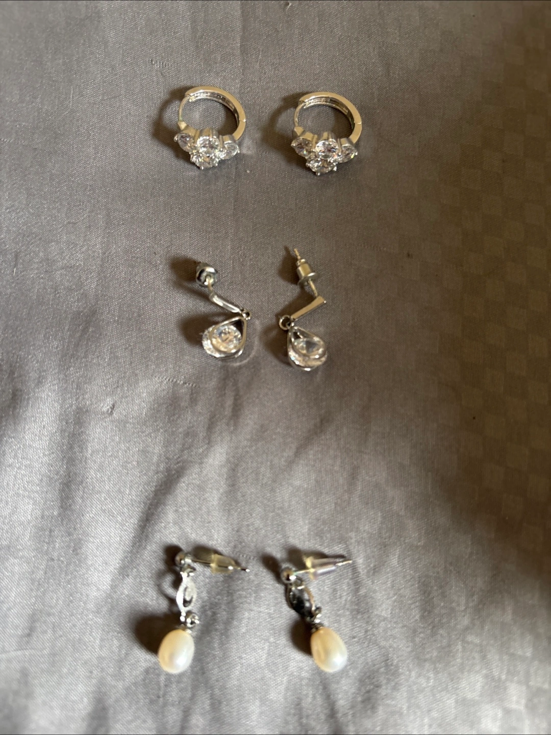 Set of three pairs of earrings. One pair small hoop earrings with cubic zirconia. Another pair dangling earrings with pear-shaped cubic zirconia. Final pair features dangling pearls. Pair for $2 or all 4 pairs for $6