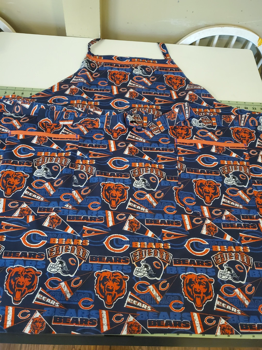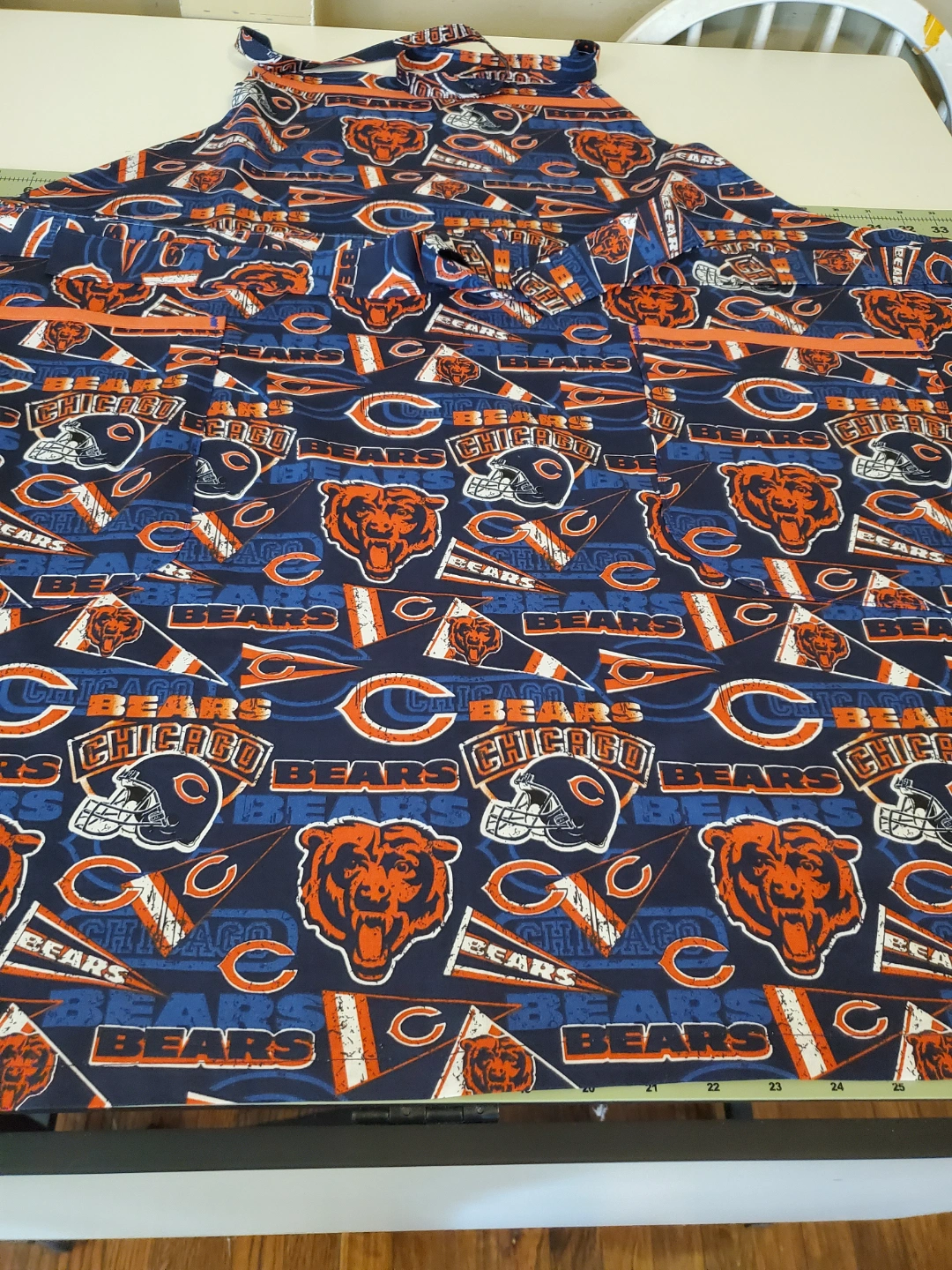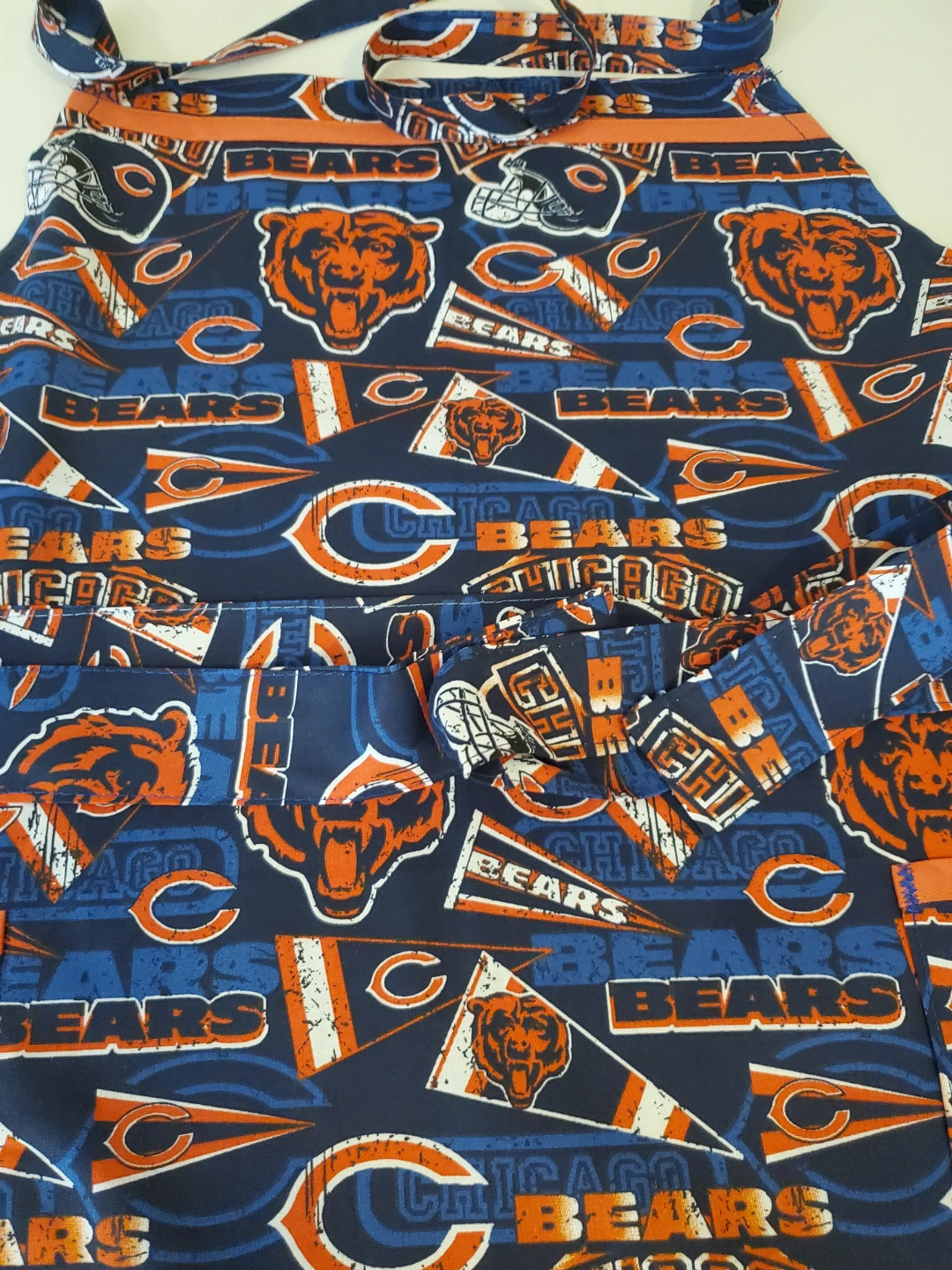 Cute handmade apron. Features Chicago Bears logo and team colors. Two pockets. Great for game day or tailgating.