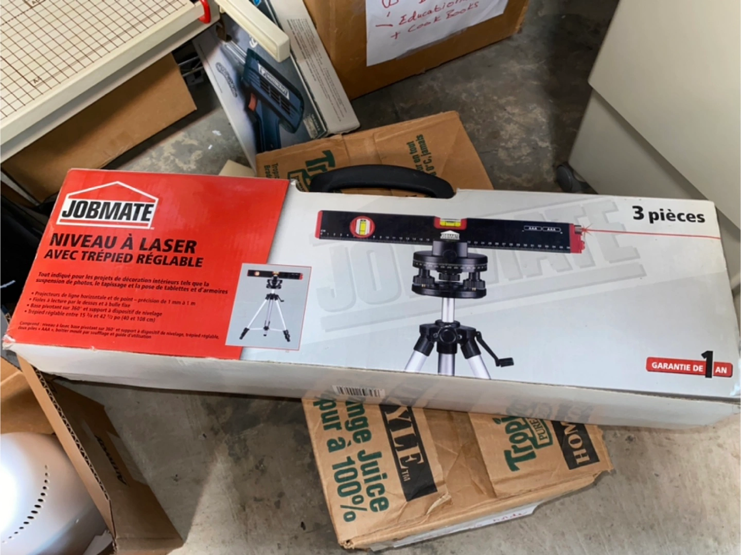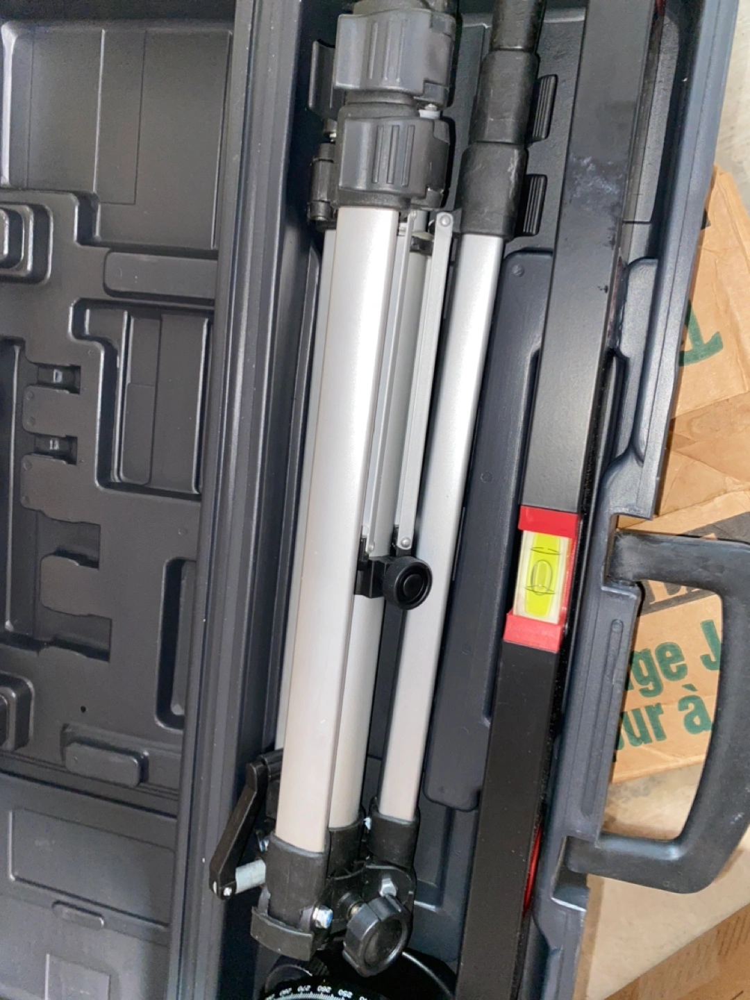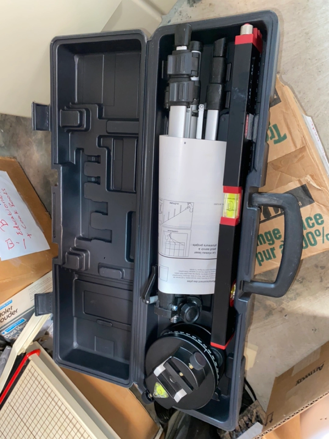 Three-piece laser level kit. Includes laser level, adjustable tripod, and carrying case. Good for various projects.