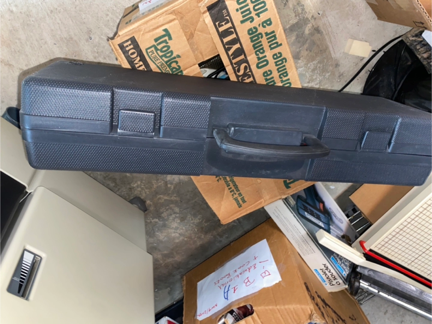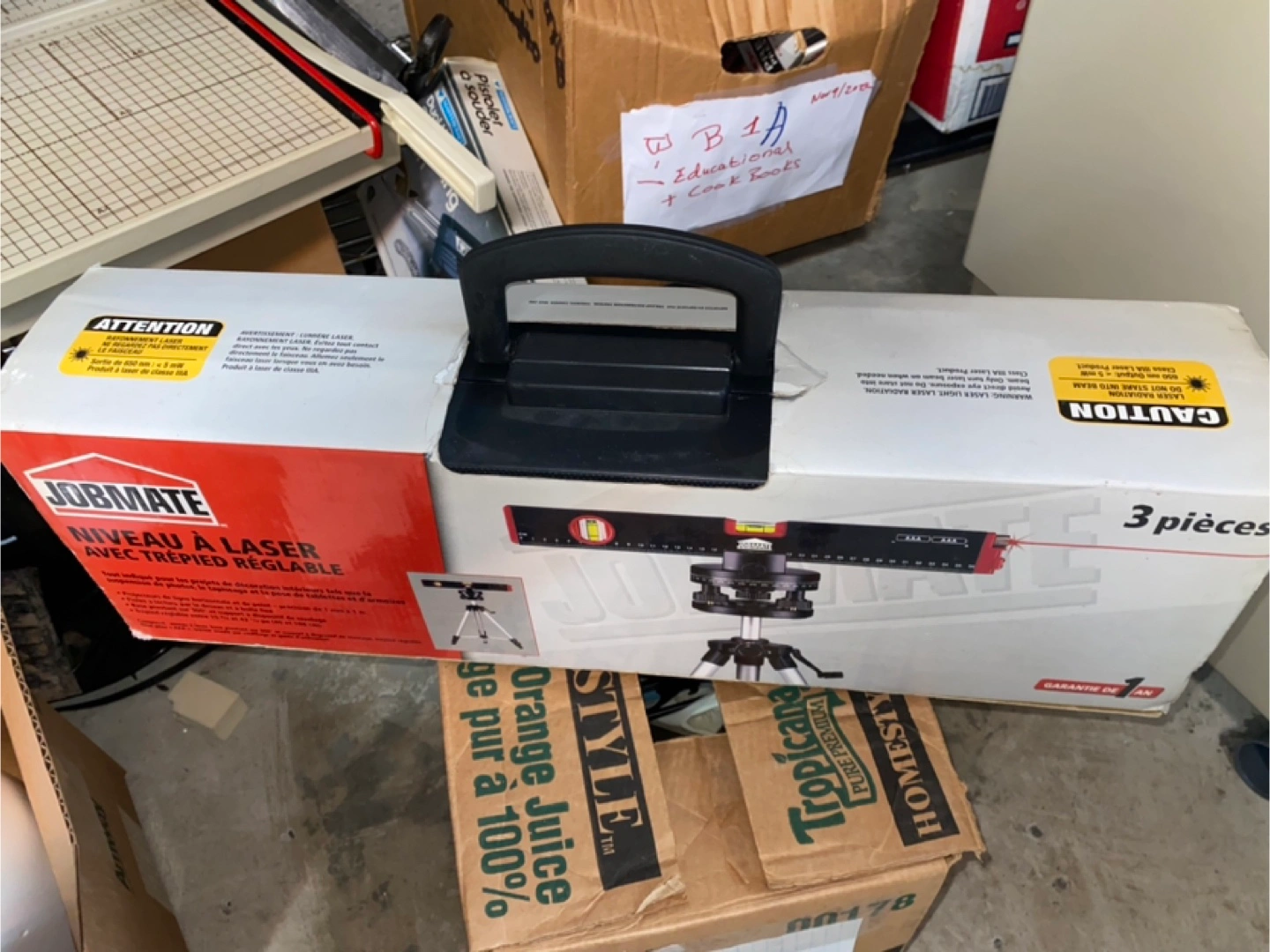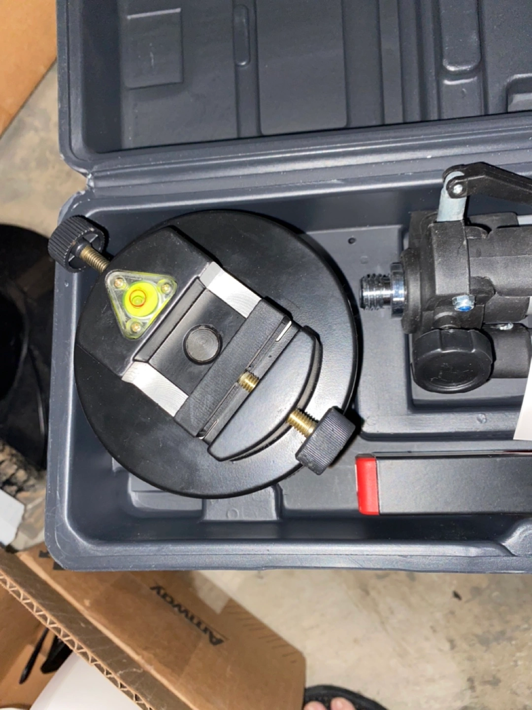 Three-piece laser level kit. Includes laser level, adjustable tripod, and carrying case. Good for various projects.