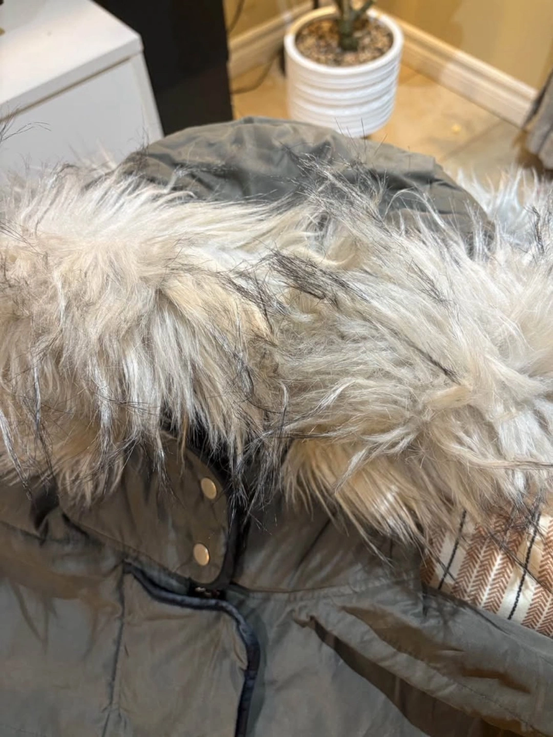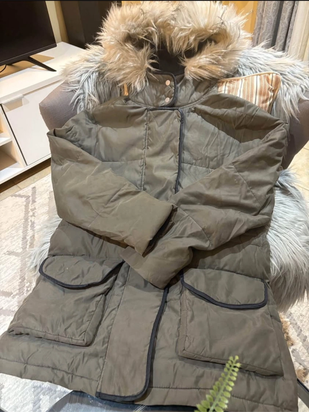 Women's olive green puffer jacket. Size small. Features a faux fur trimmed hood, multiple pockets, and a water-resistant and wind-resistant design. Made in Vietnam.