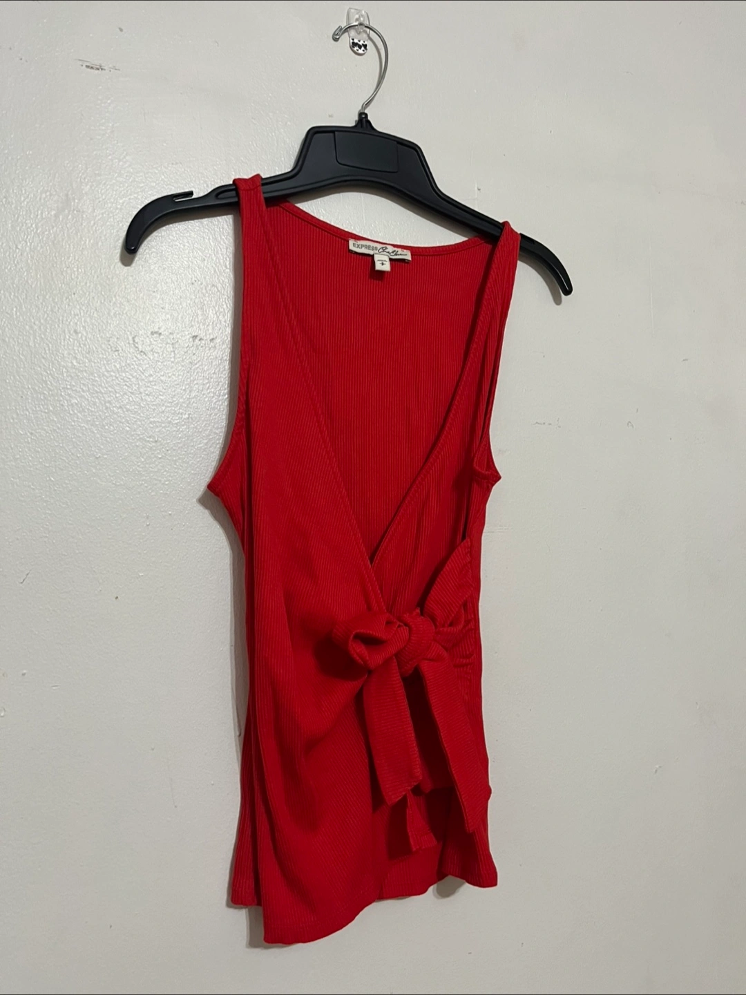 Women's red ribbed knit tank top. Features a wrap design with a bow tie detail. Size small. A little darker red in-person.