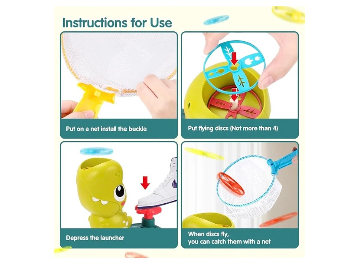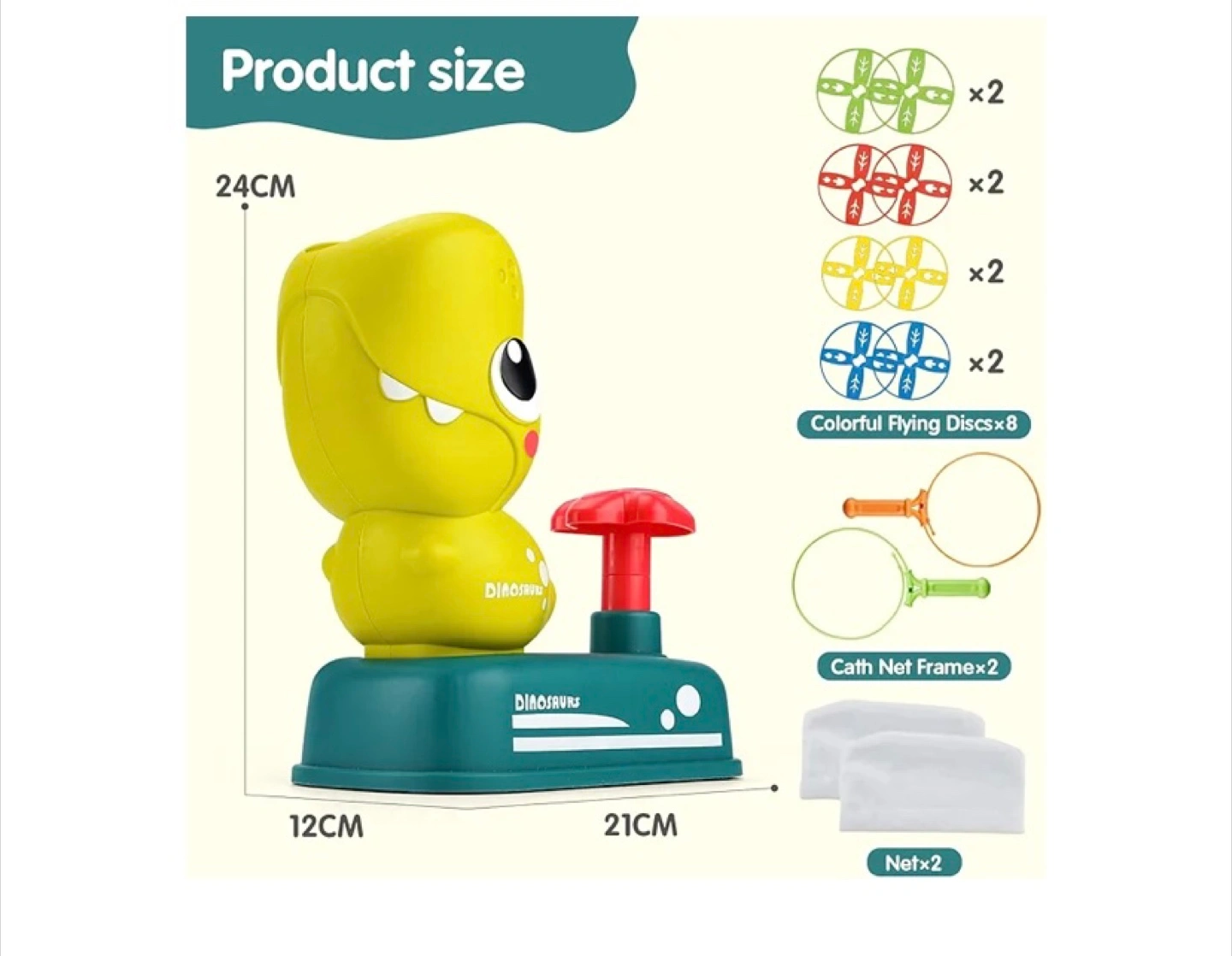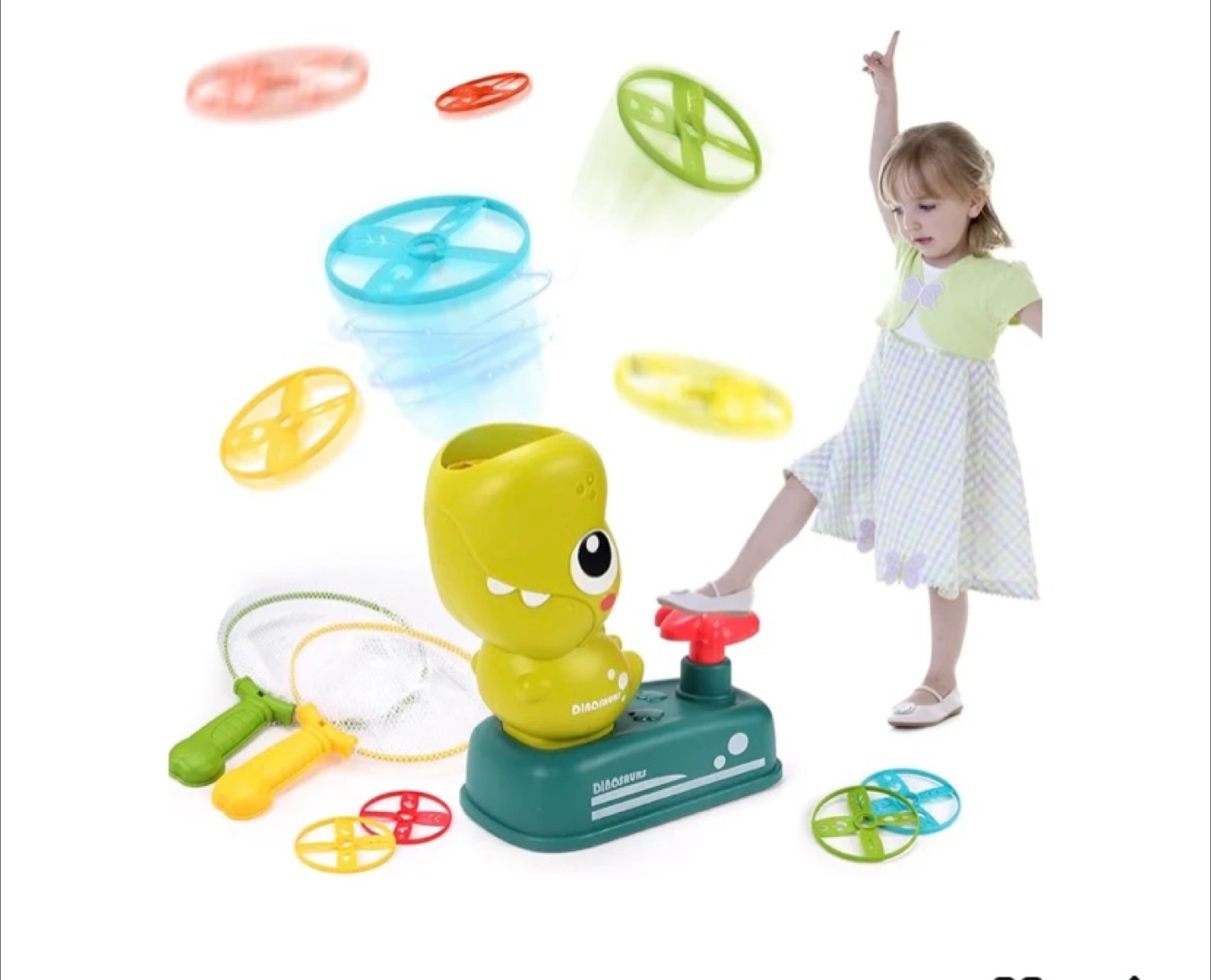 Fun outdoor game. Includes dinosaur launcher, 8 flying discs, and 2 catching nets. Great for improving hand-eye coordination and family fun. Ages 3+