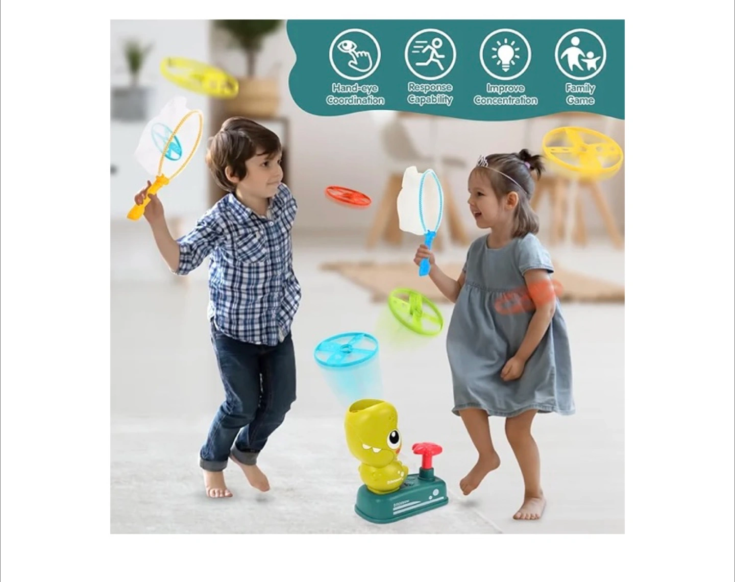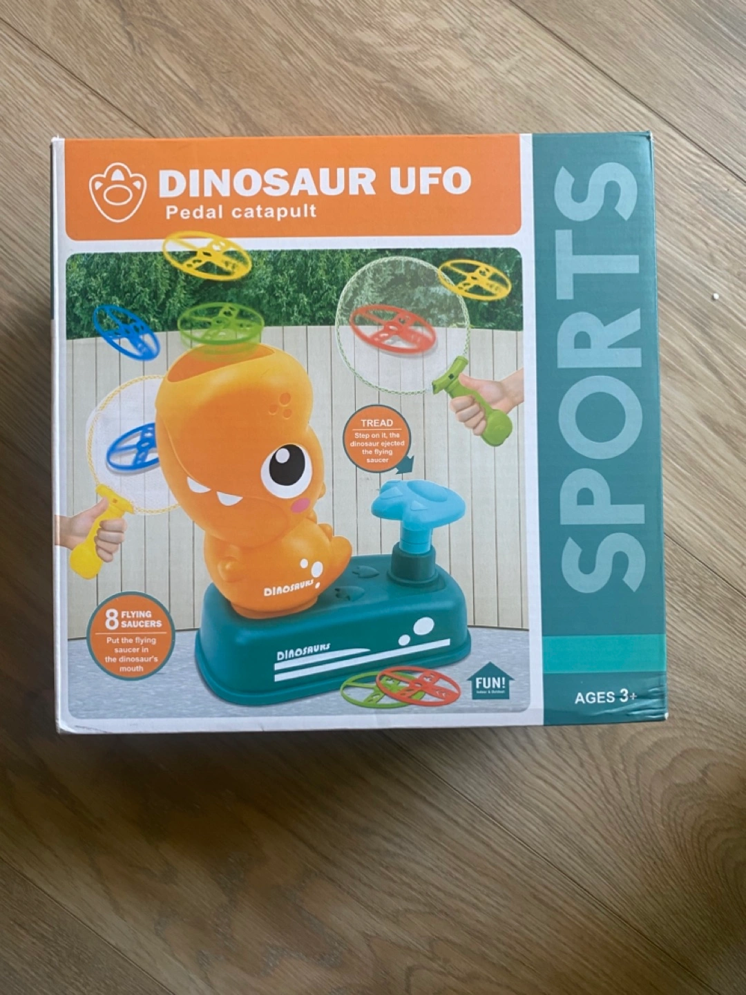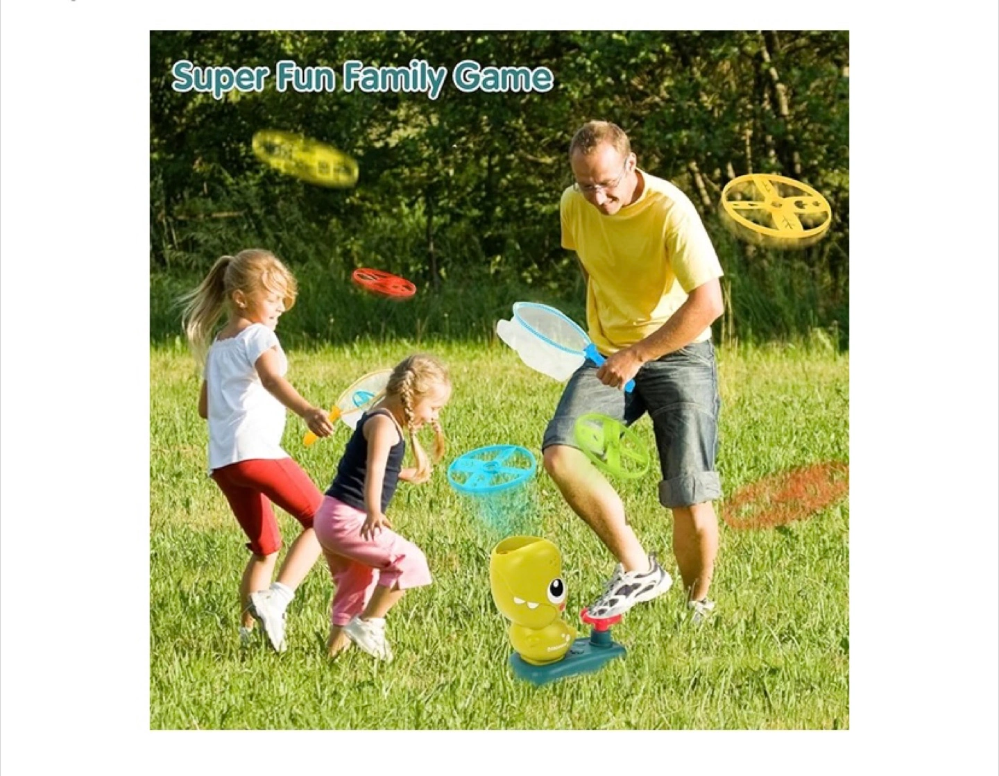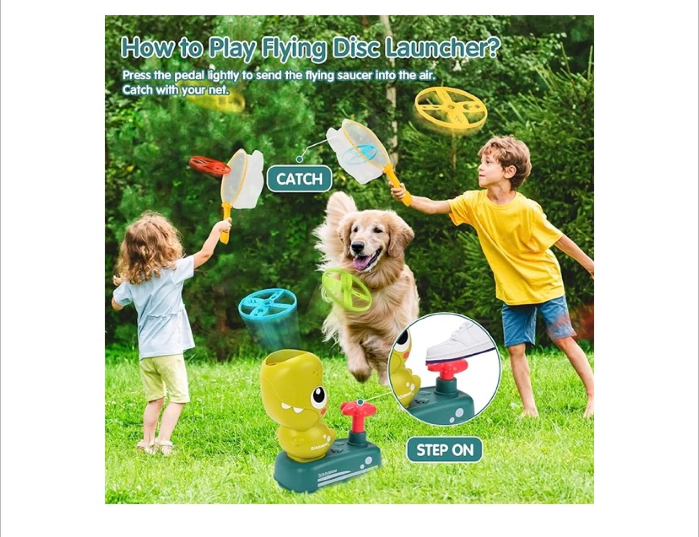 Fun outdoor game. Includes dinosaur launcher, 8 flying discs, and 2 catching nets. Great for improving hand-eye coordination and family fun. Ages 3+