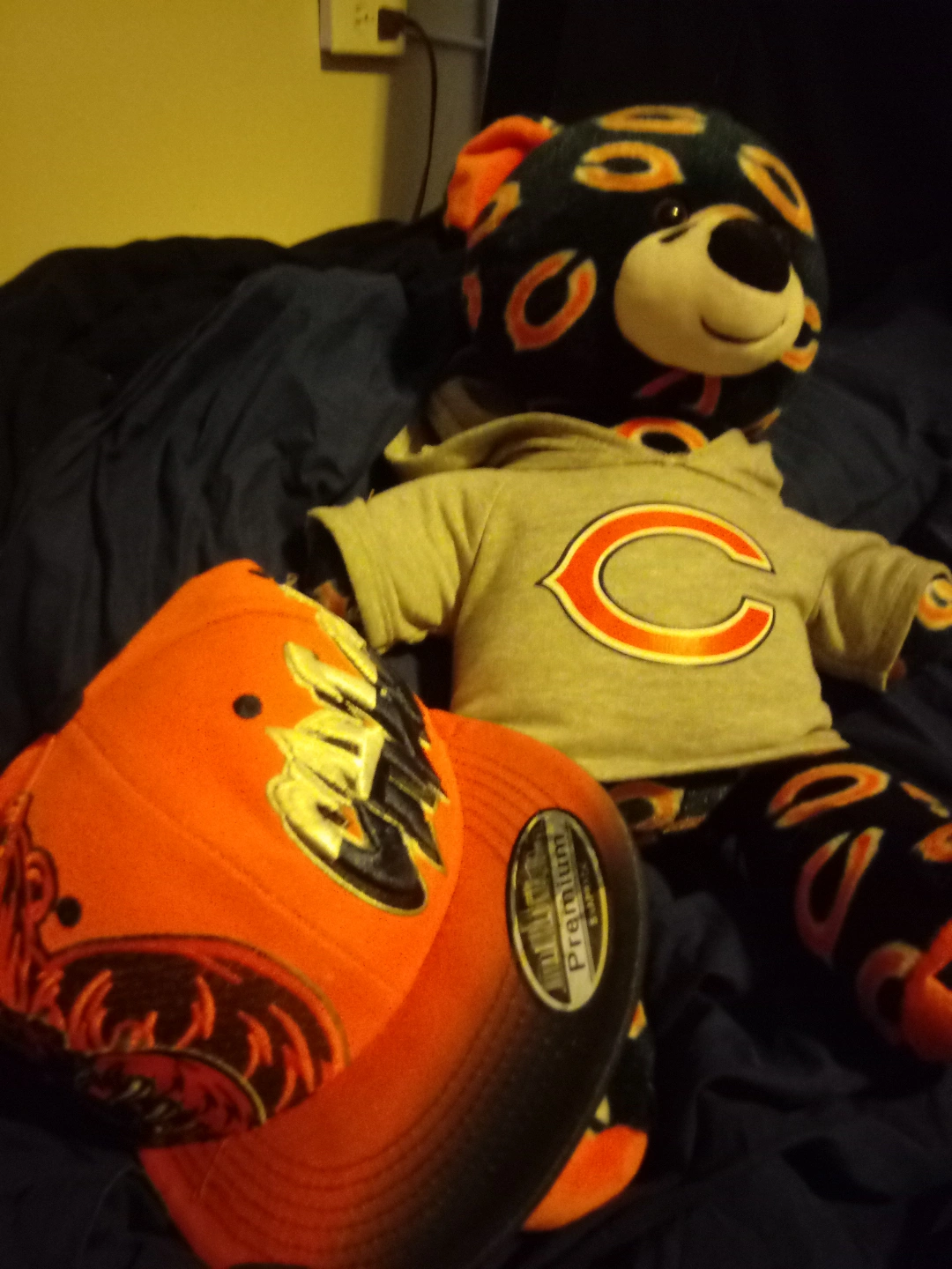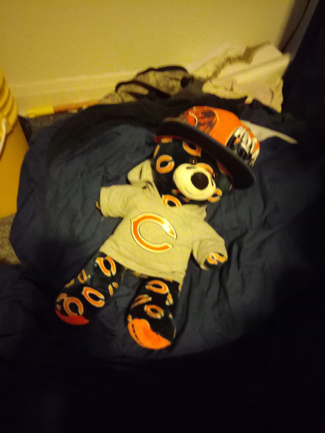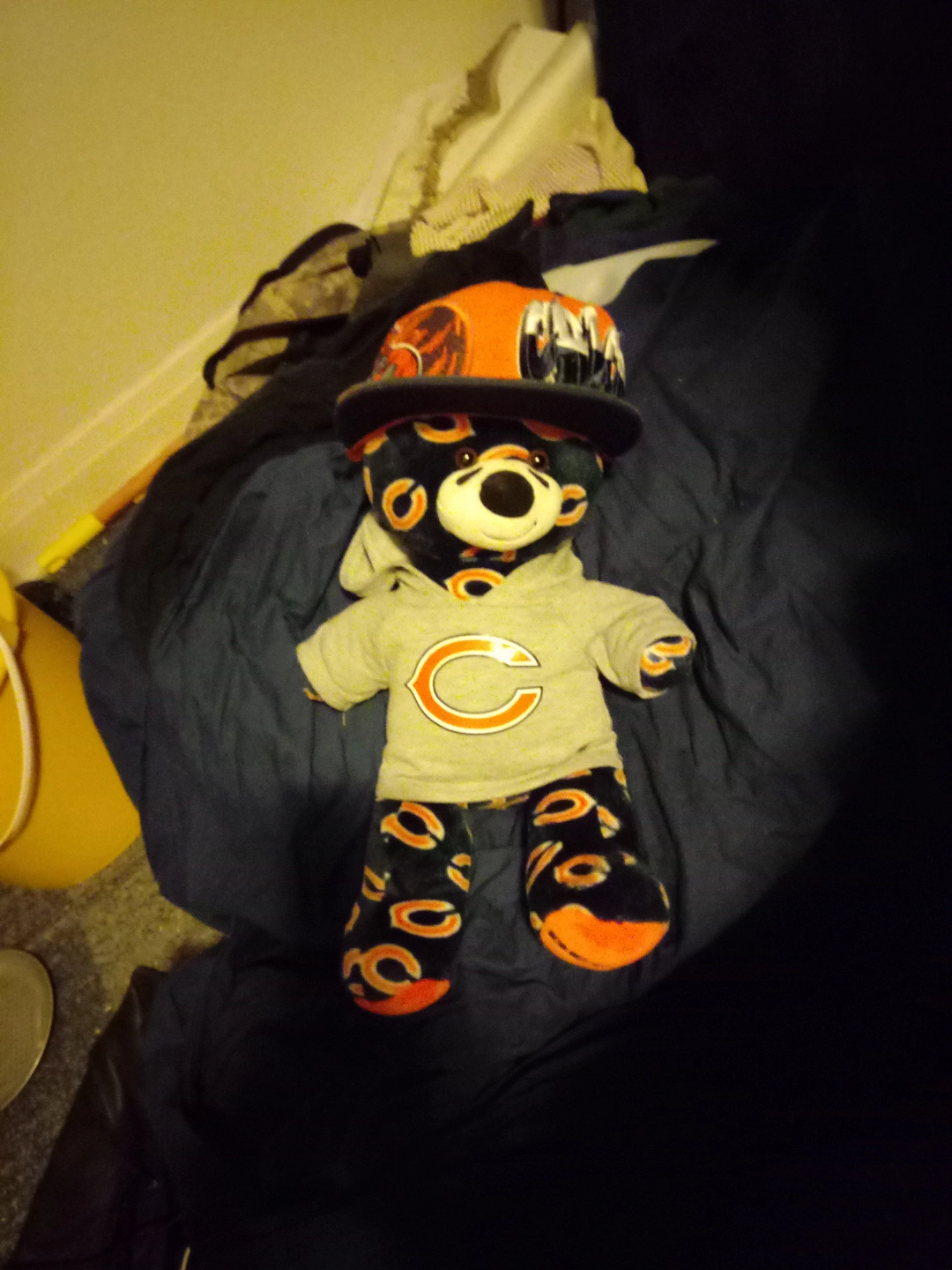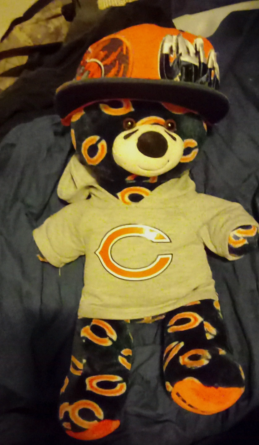Chicago Bears themed Build-A-Bear. Gray hoodie with a large C logo. Matching pants. Orange and black design. Includes an orange and orange hat. 50 obo