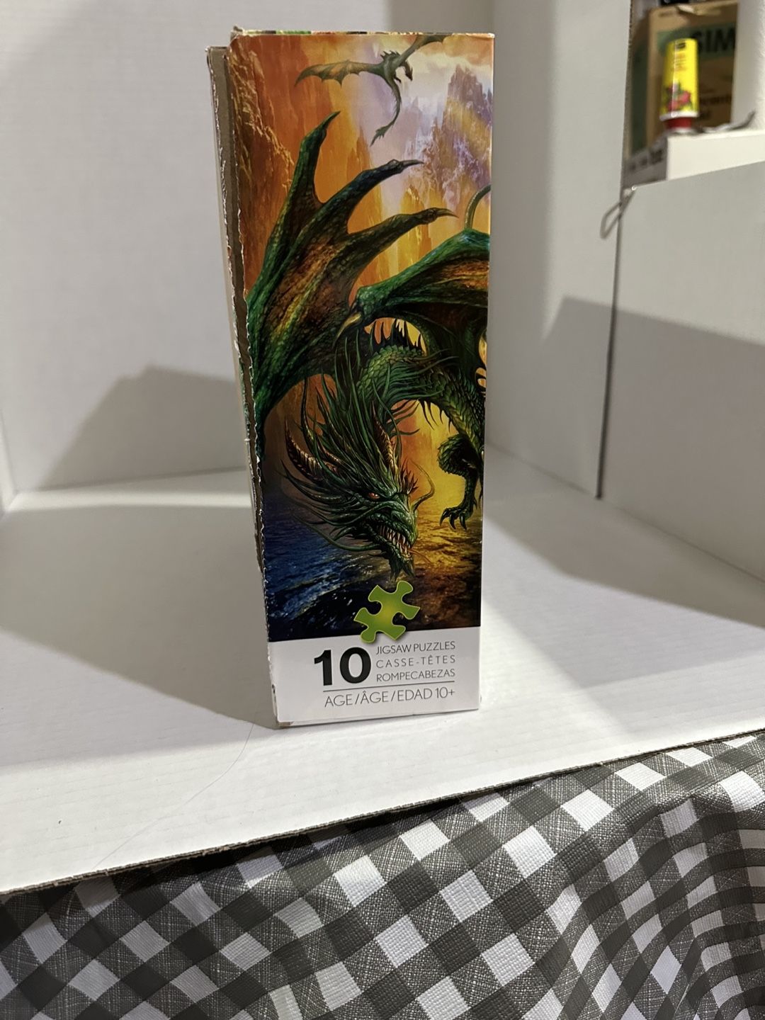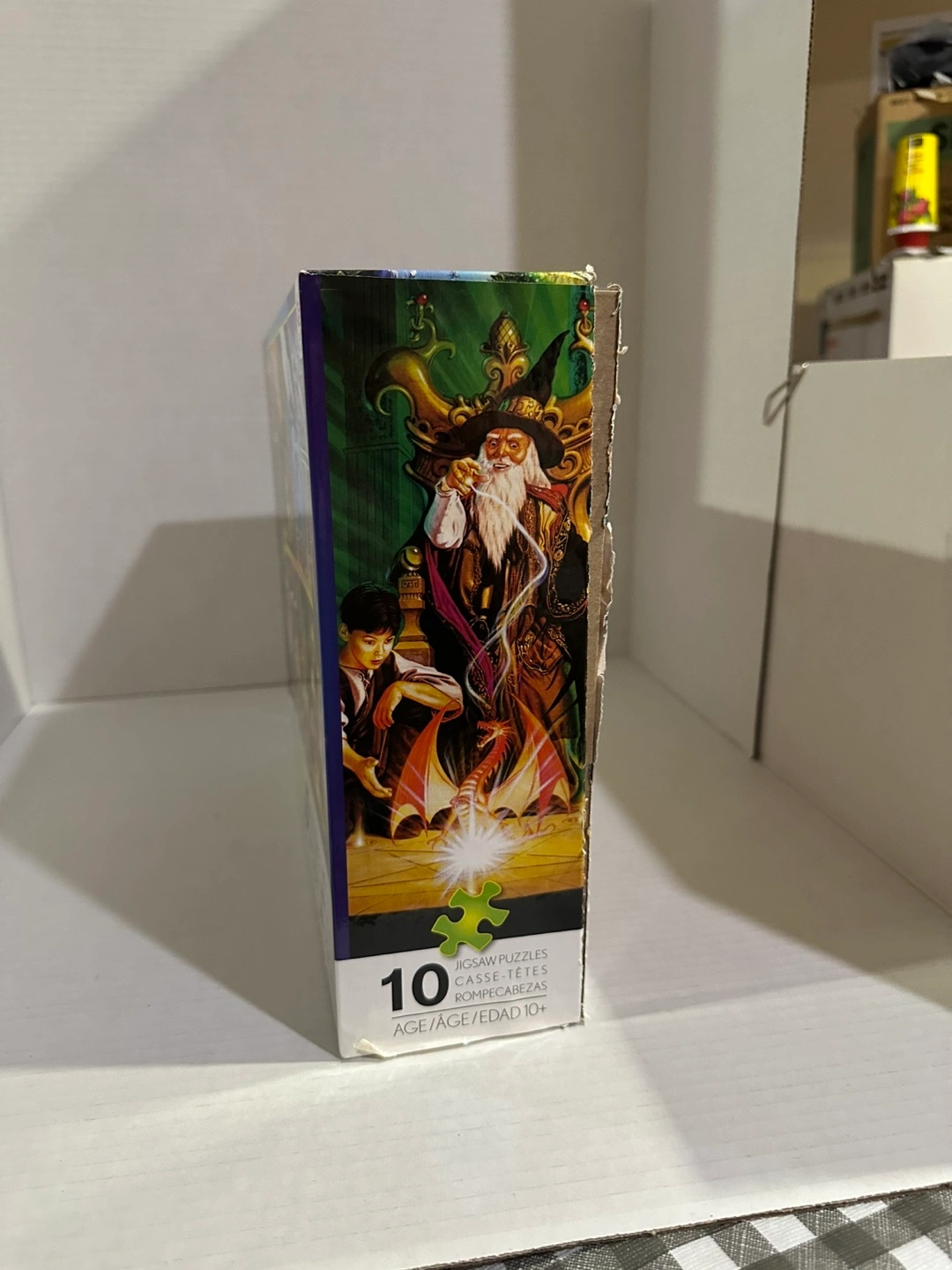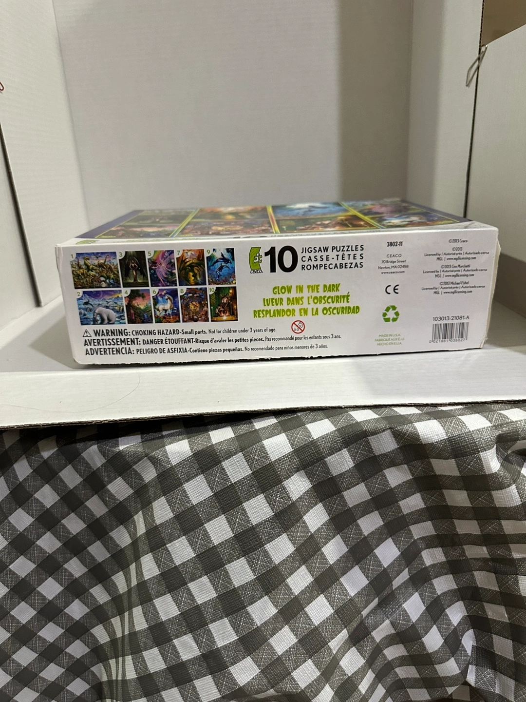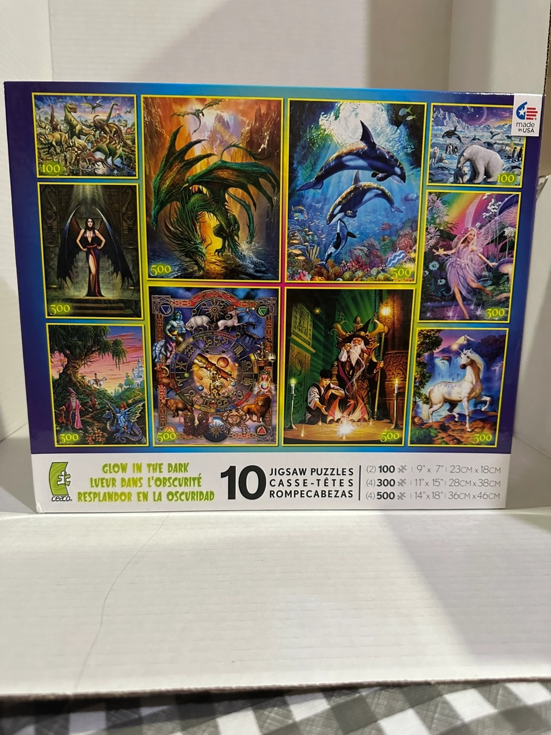 Set of 10 glow-in-the-dark jigsaw puzzles. Various designs included, piece counts vary. Ages 10+. Box is open but never put together