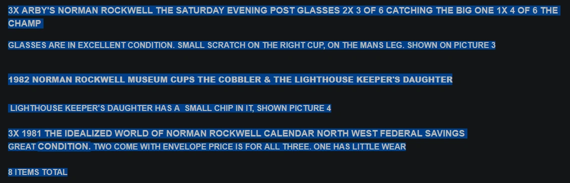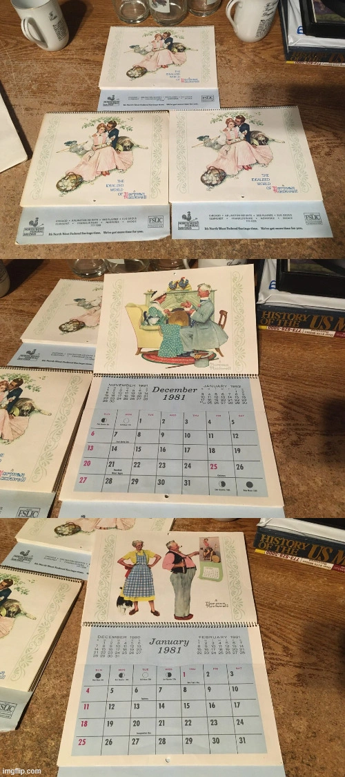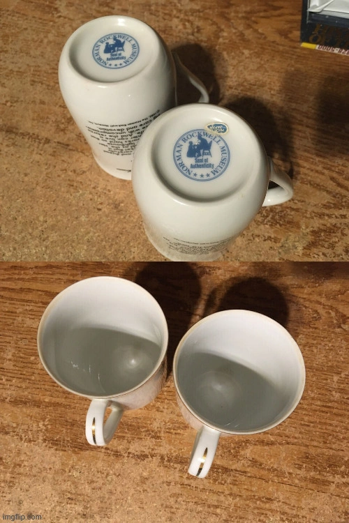 Set of Norman Rockwell mugs and glasses. Features various illustrations from The Saturday Evening Post. Collectible items, excellent condition. Includes calendars. The one cup has a small chip in it shown on the second picture last picture for details on all items all good except for the one cup mentioned pick up at house