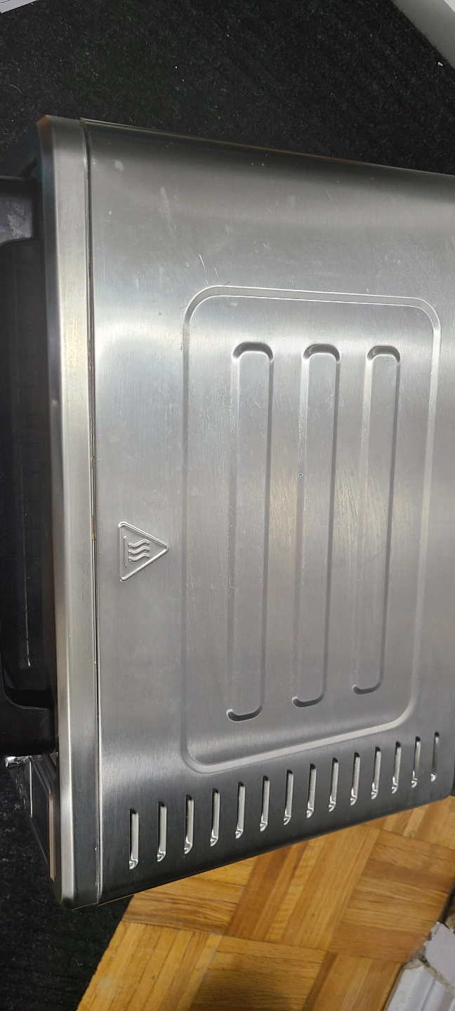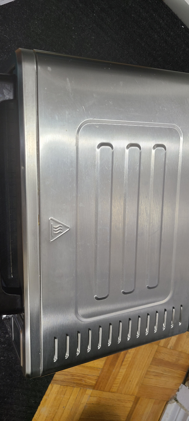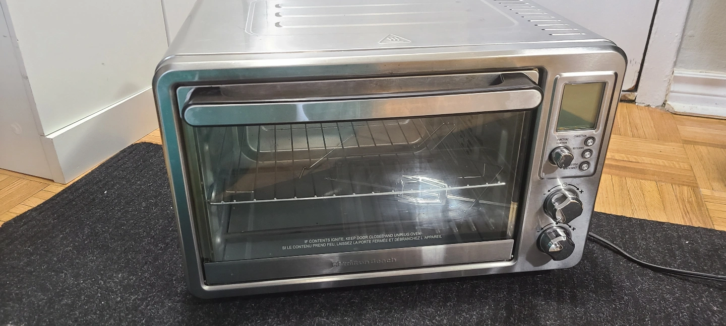Stainless steel countertop oven. Features digital display, rotisserie, and large 6-slice capacity. Includes a grill rack. Rotisserie accessory is not used and is new. Getting rid of it to get some counter space back.