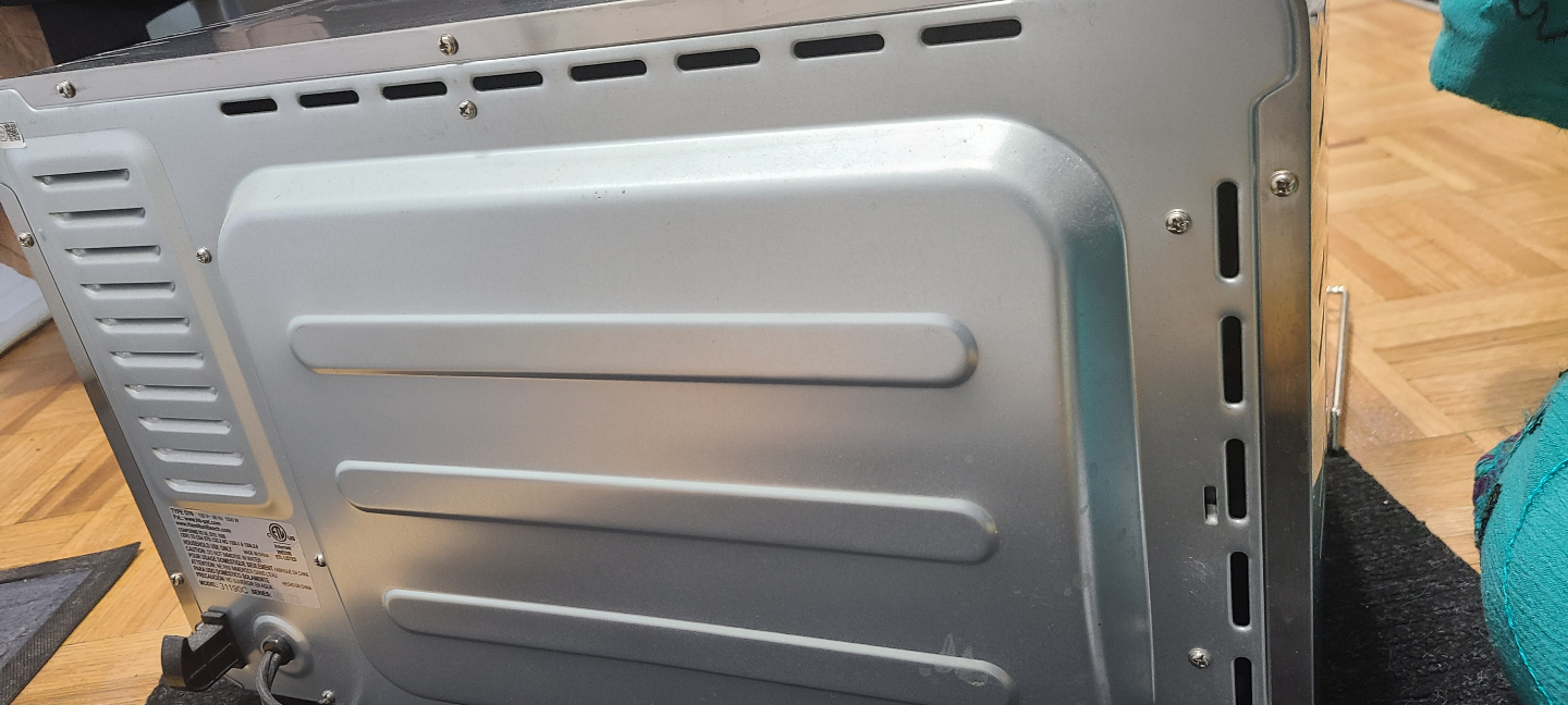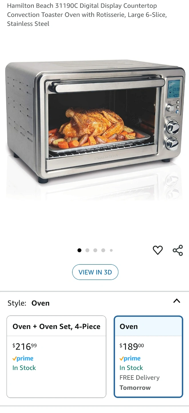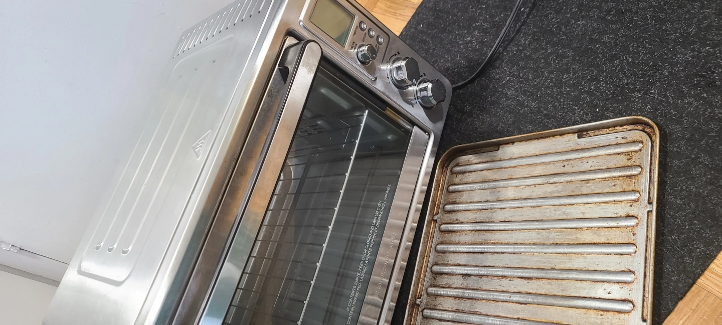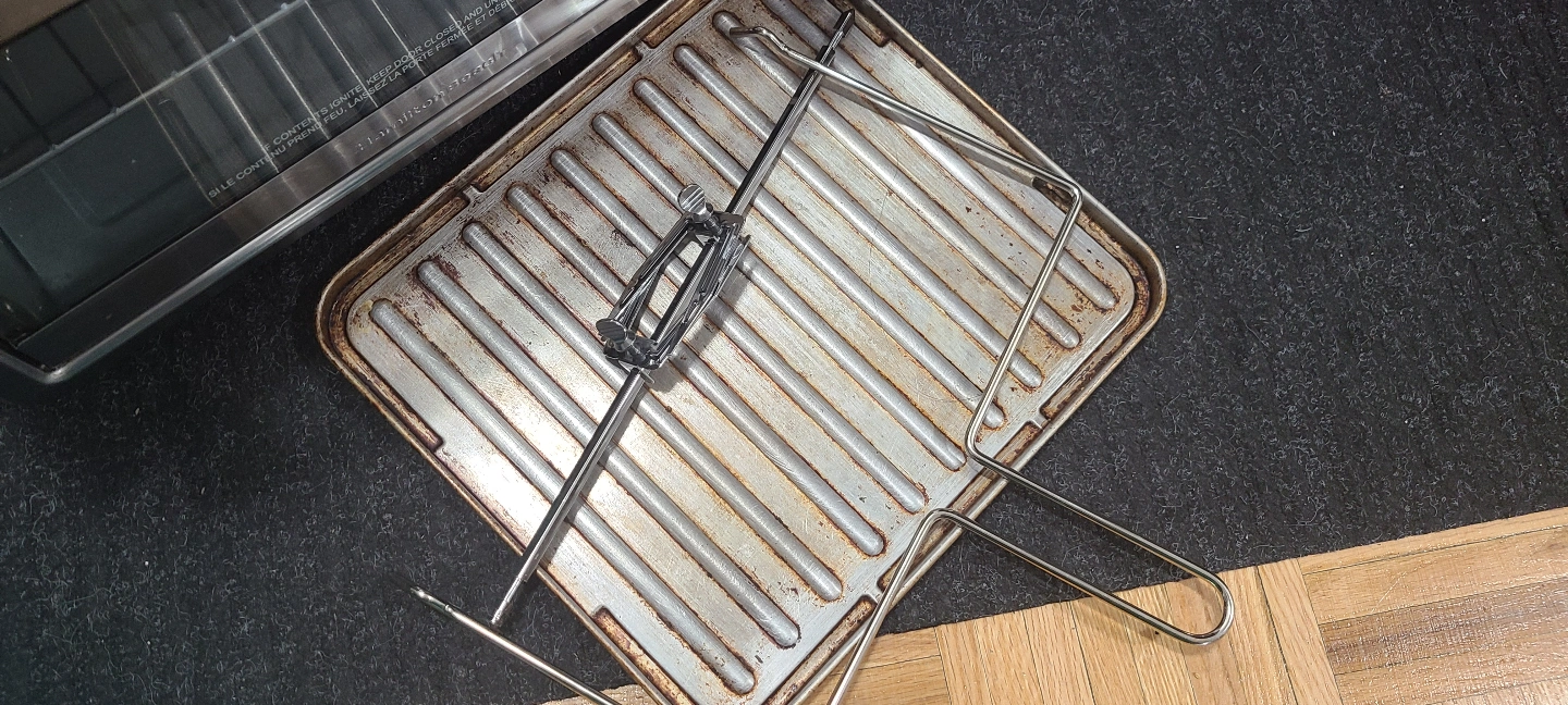 Stainless steel countertop oven. Features digital display, rotisserie, and large 6-slice capacity. Includes a grill rack. Rotisserie accessory is not used and is new. Getting rid of it to get some counter space back.