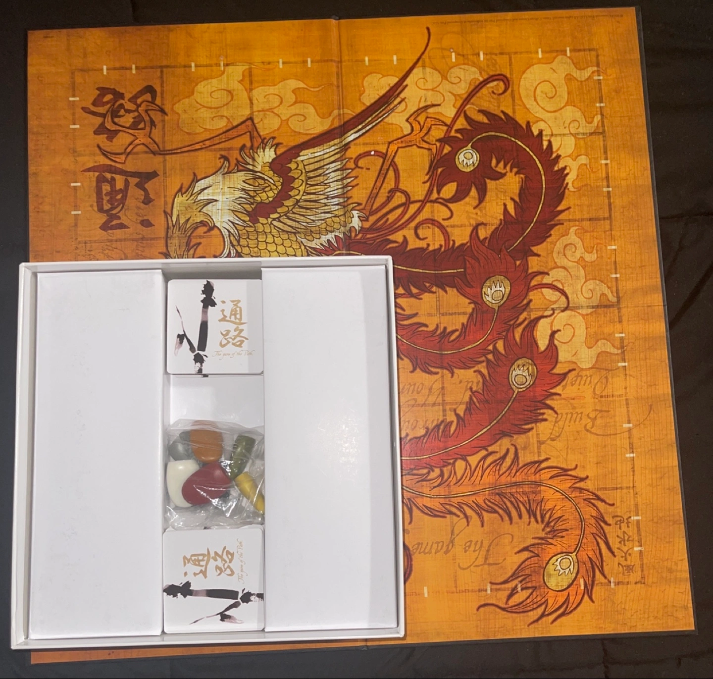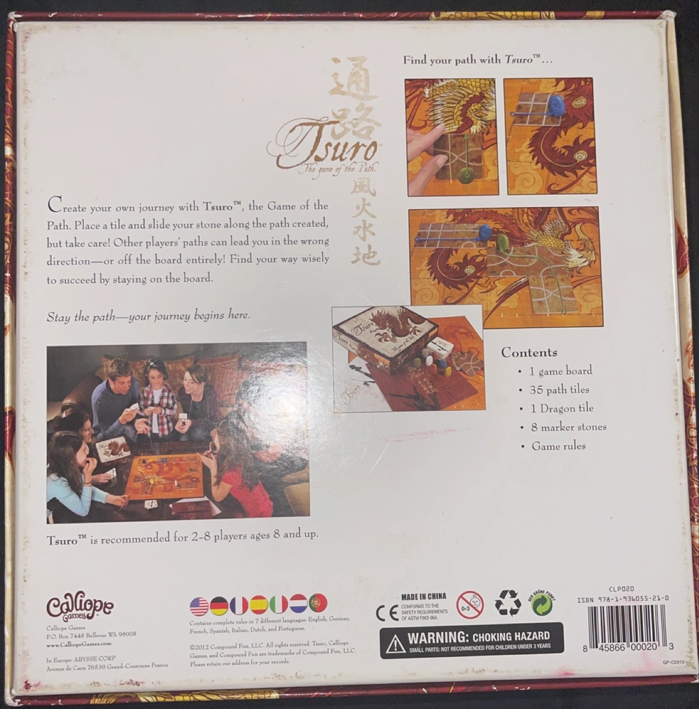 Board game for 2-8 players ages 8+. Includes game board, path tiles, dragon tile, marker stones, and game rules. Create your own journey. Players strategically place tiles to lead their path. Fun for the whole family!