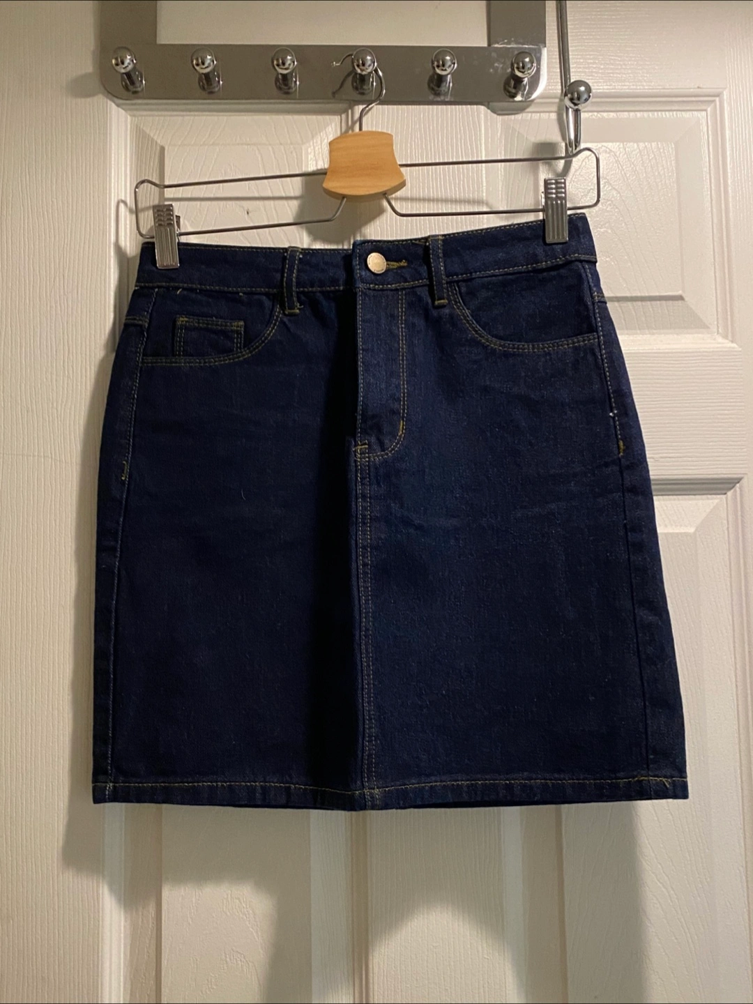 Women's dark wash denim mini skirt. Classic style, five-pocket design. Good condition.