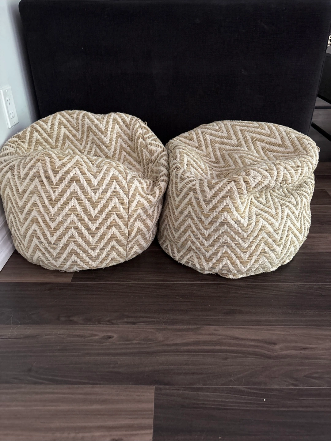 Two comfortable stylish poufs, Modern beige and cream chevron pattern. Perfect for extra seating or as a stylish accent piece. Great condition few pulls (can fix) machine washable!