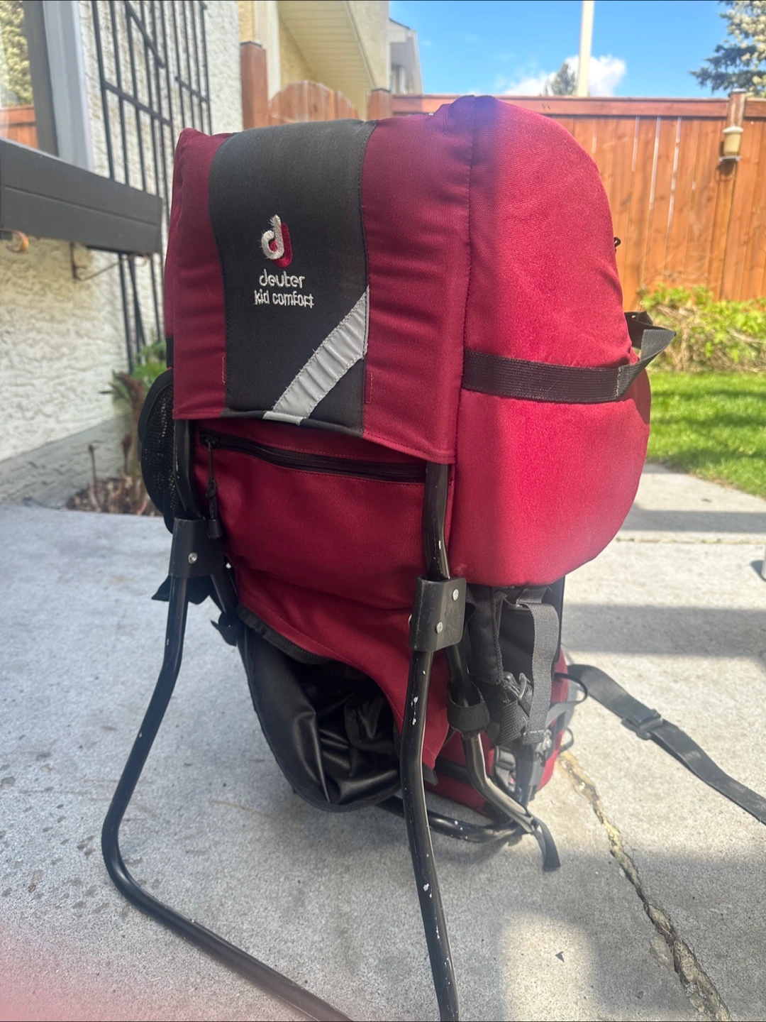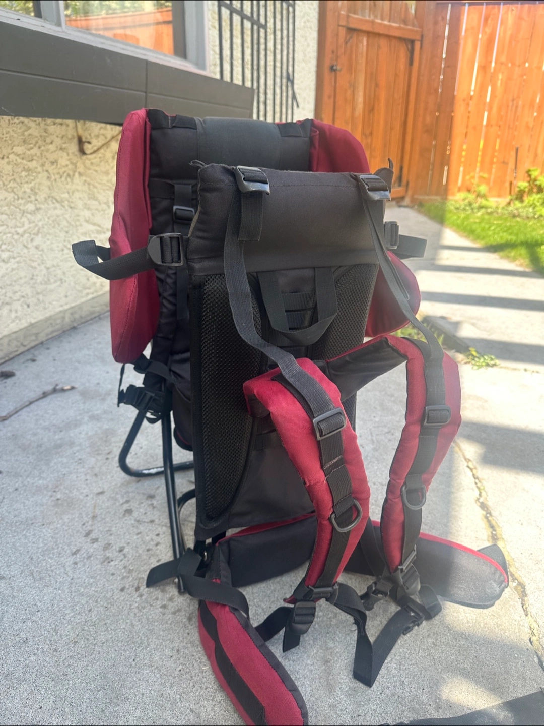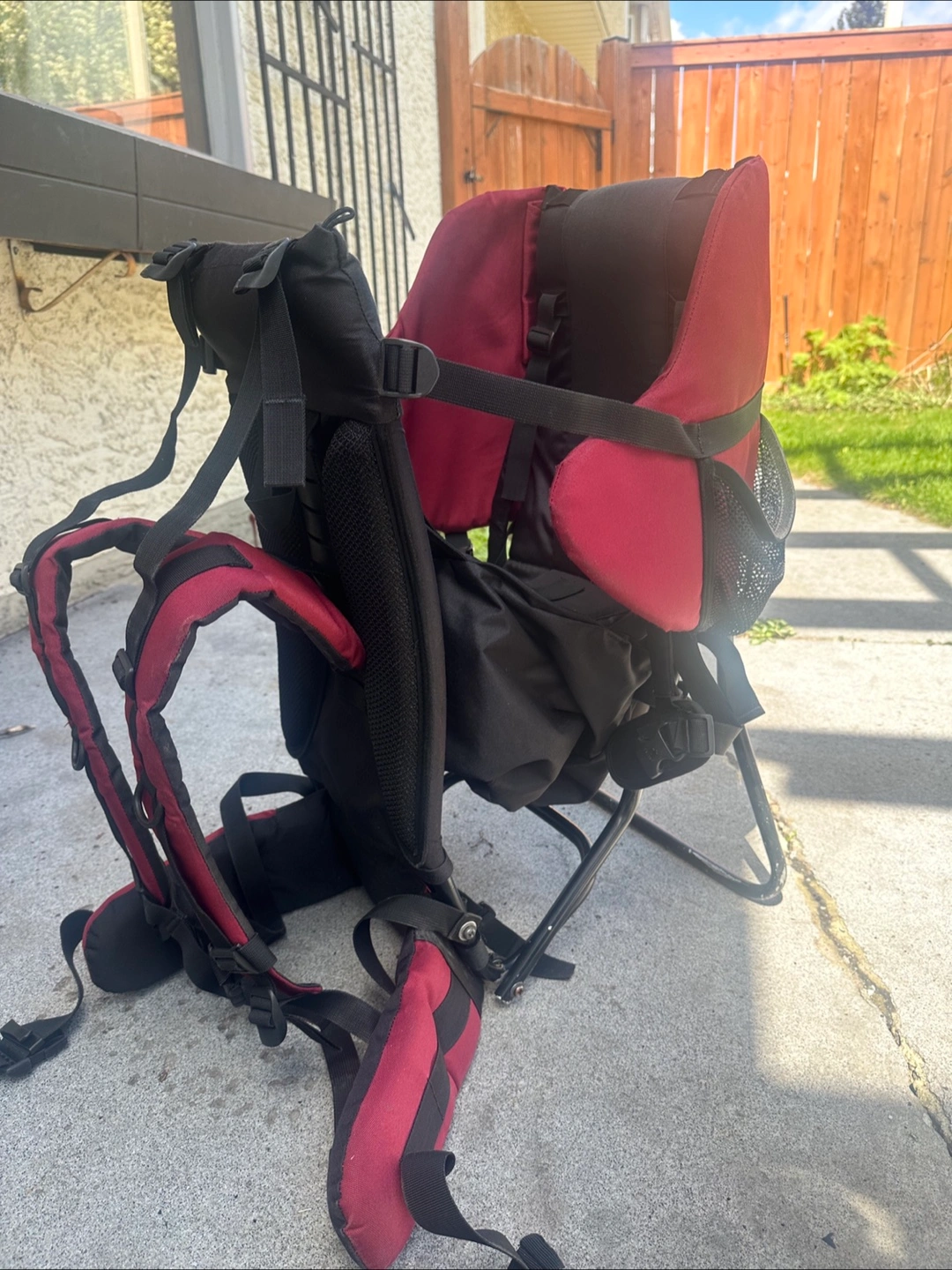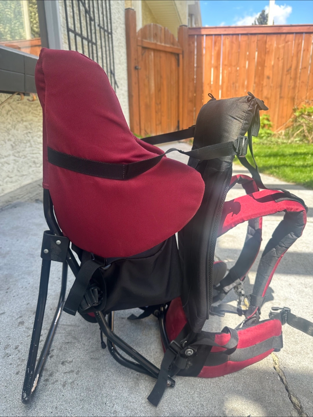 Red and black child carrier backpack. Features adjustable straps and a stand. Suitable for hiking and outdoor adventures and festivals. Good used condition.