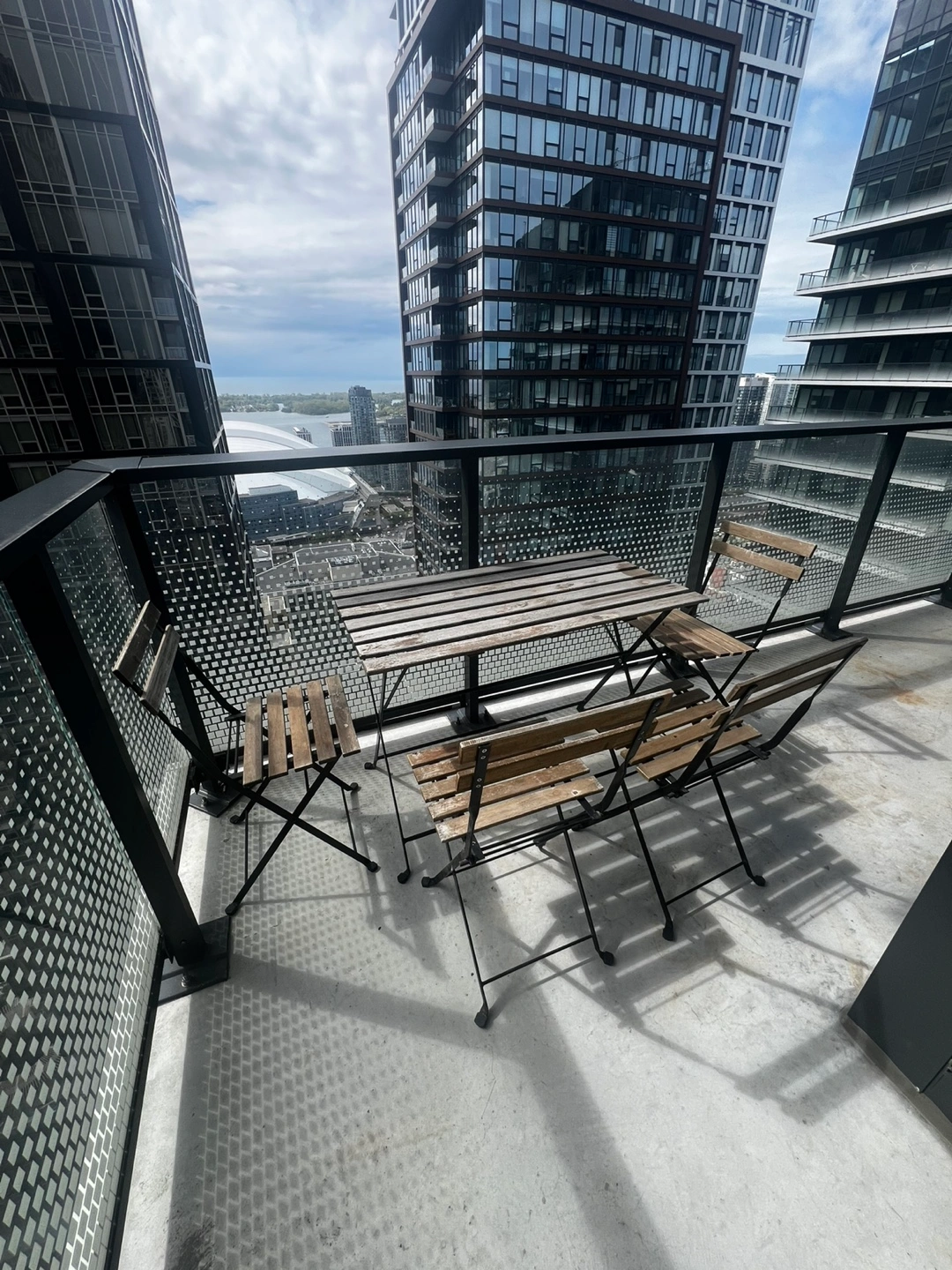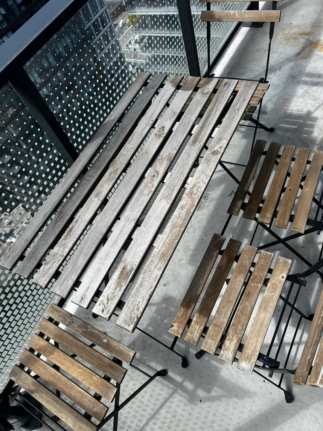 Wooden folding table and four chairs. Great for small balconies or patios. Shows some wear from weather exposure.
