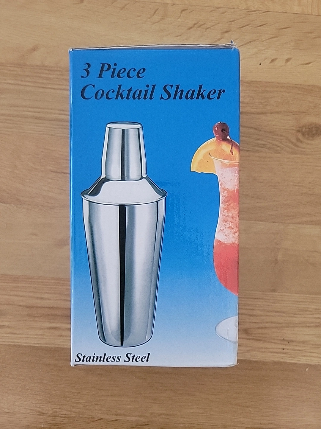 New, unopened 3-piece cocktail shaker set. Includes a stainless steel cocktail shaker, jigger, and a drinking glass. 28 oz capacity. Perfect for home bartending.