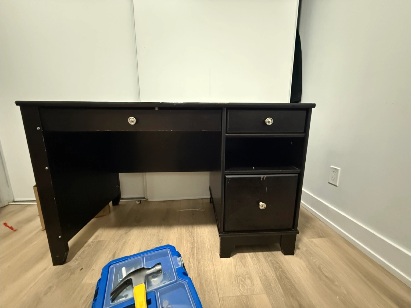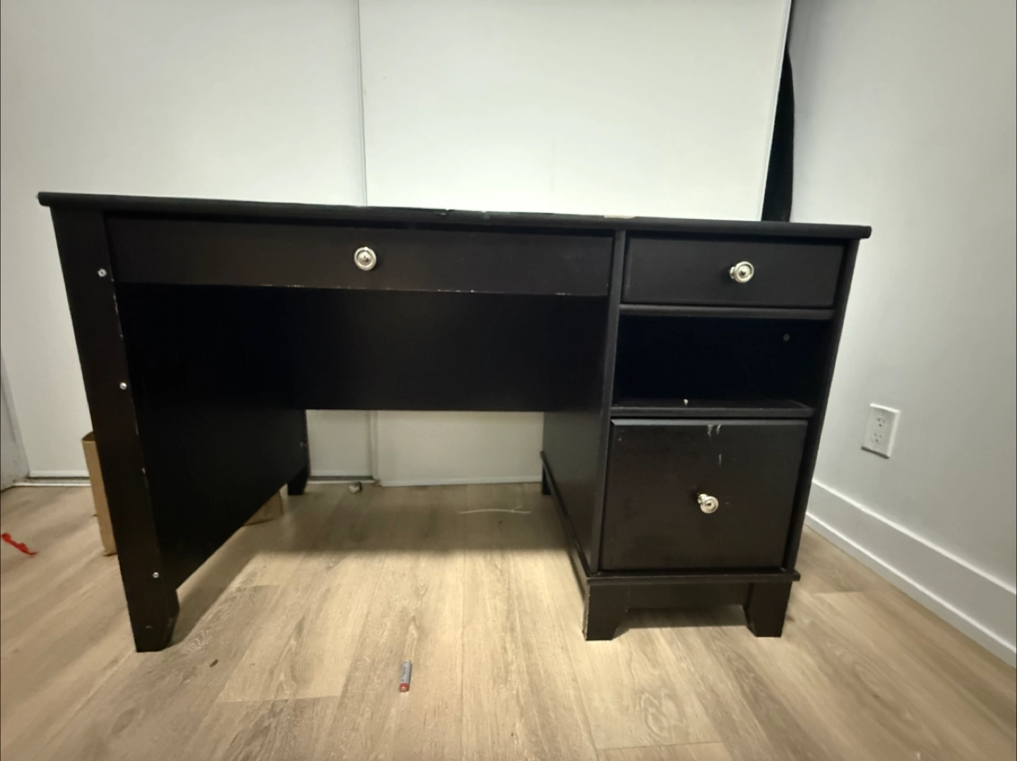 Dark brown wooden desk. Features two small drawers, one large drawer, and an open shelf. Solid wood construction. Some minor wear and tear.