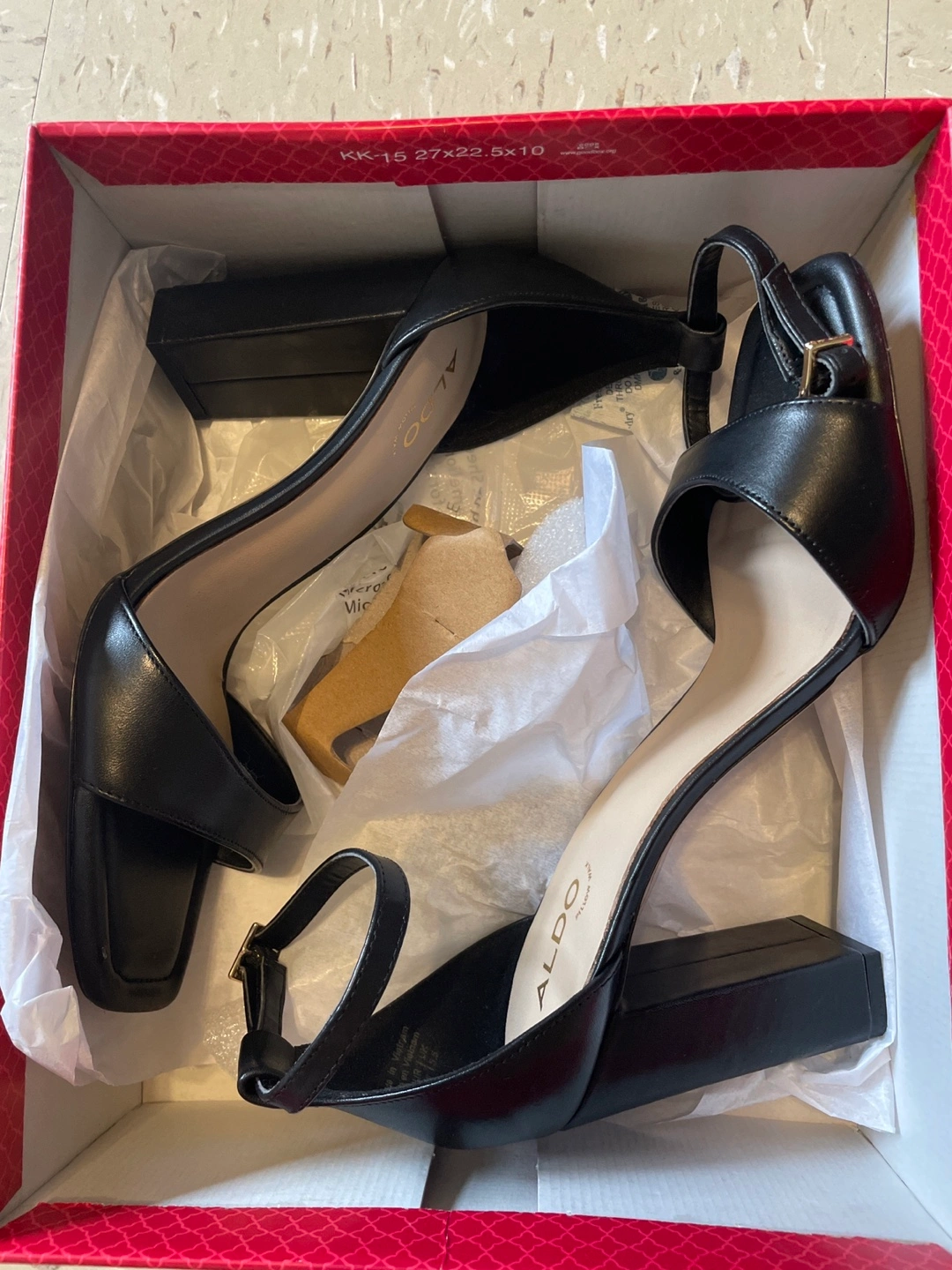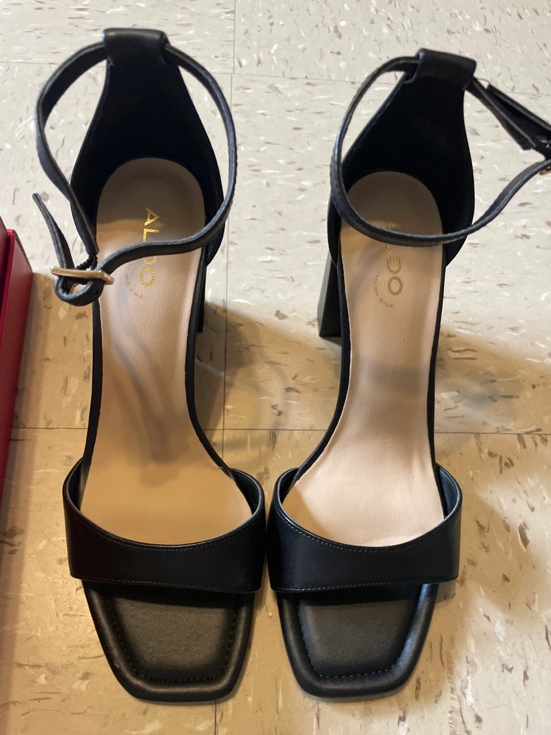 New, never worn Aldo black leather heeled sandals. Ankle strap closure. Block heel. Size not specified.