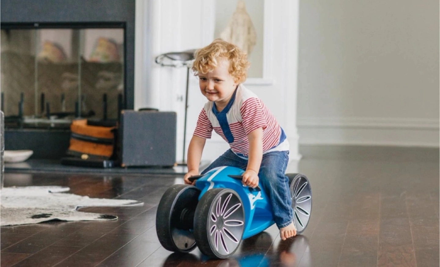 Blue and black children's ride-on toy. Features large wheels. Suitable for toddlers. For both indoor and outdoor. Pick up only in Thornhill.