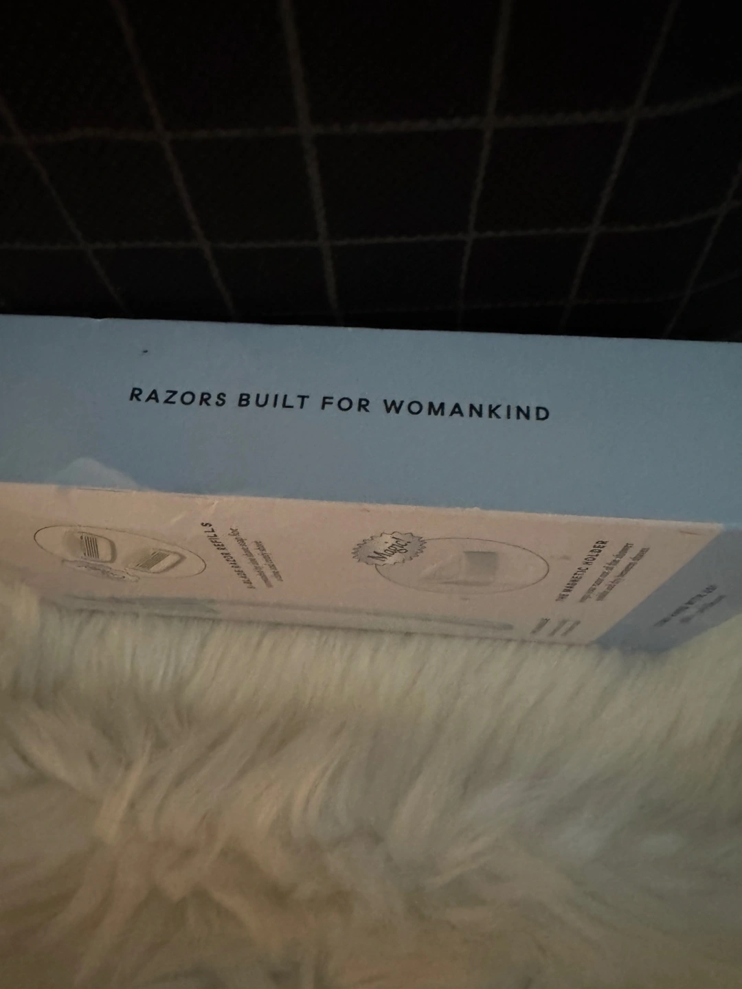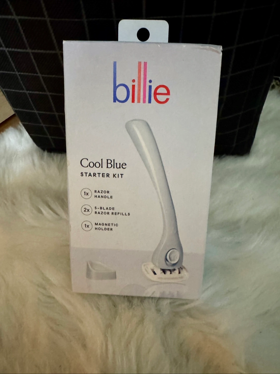 New, unopened Billie razor starter kit. Includes razor handle, two 5-blade refills, and magnetic holder. Cool blue color.