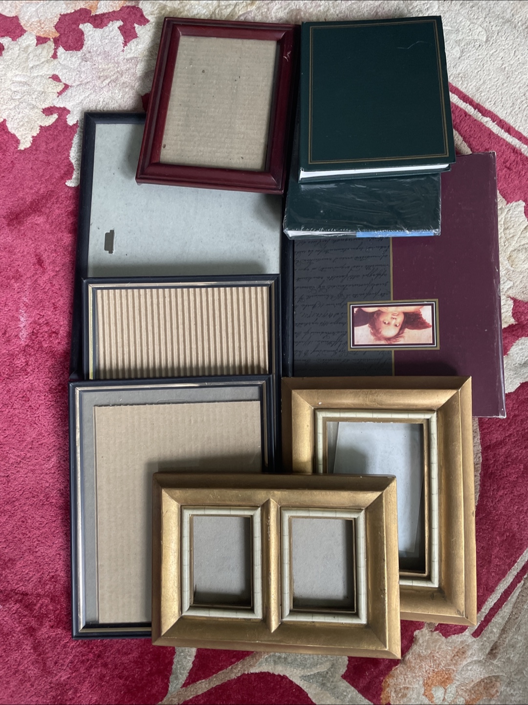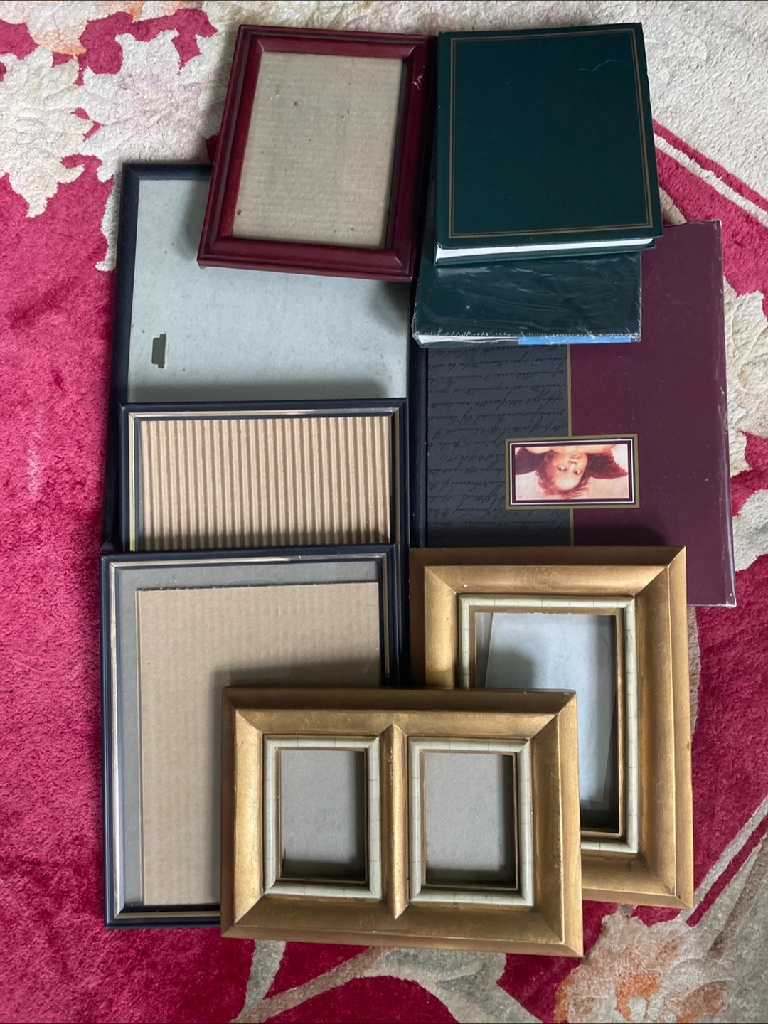 Variety of picture frames and photo albums. Sizes and styles vary. Some frames are empty. Albums appear unused. Great for organizing photos or crafting projects.