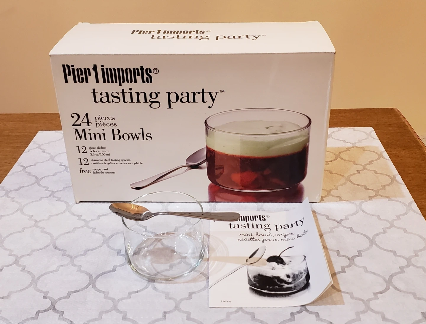 New in box. 24 piece mini bowl set. Includes 12 glass bowls and 12 stainless steel tasting spoons. Recipe card included. 5.3 oz/150ml bowls.