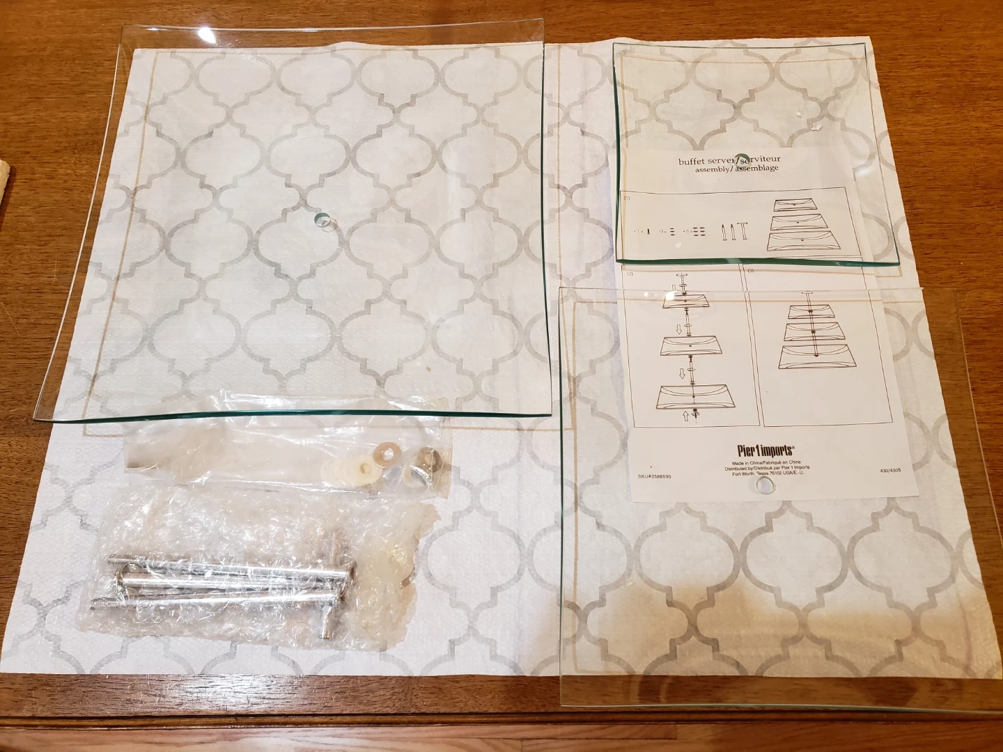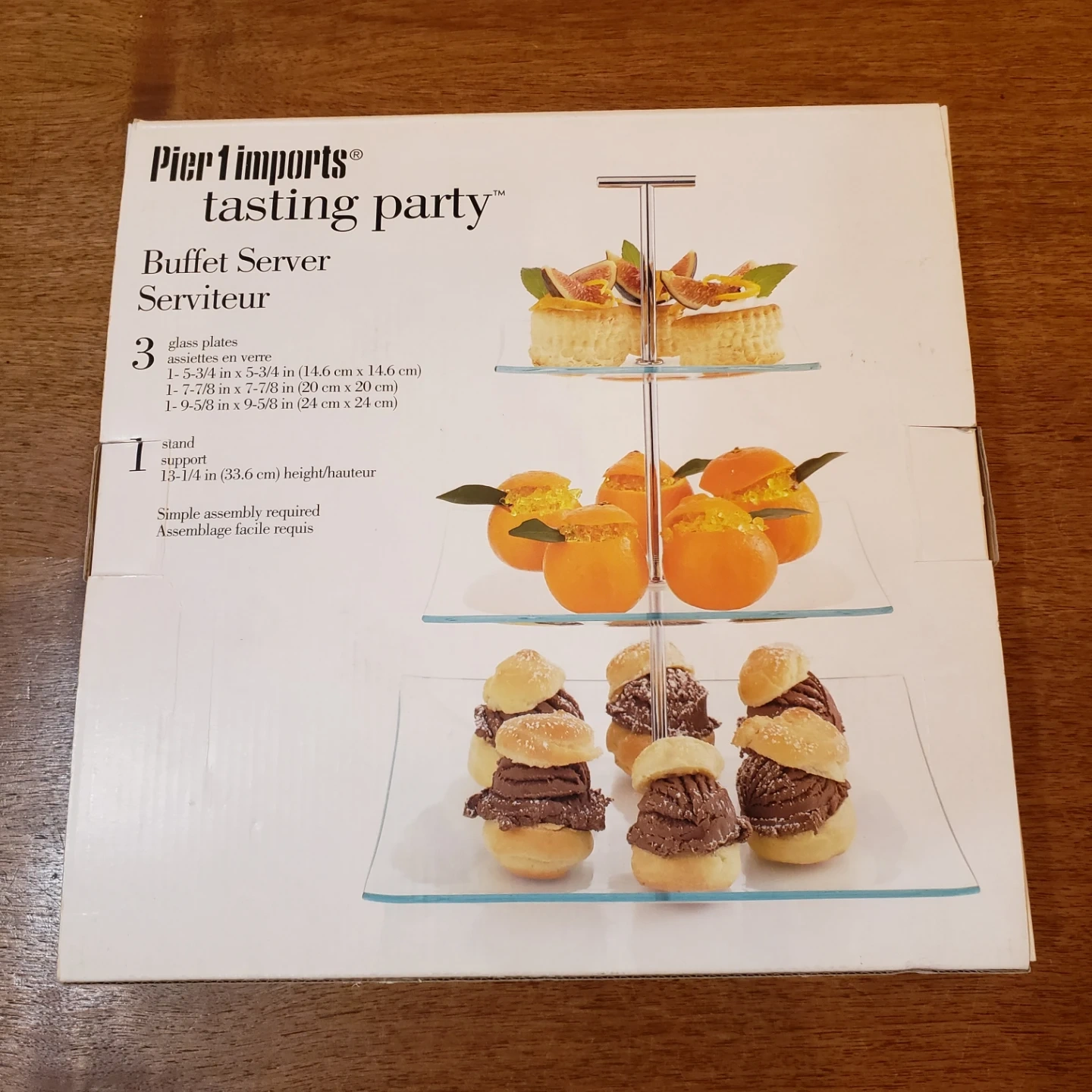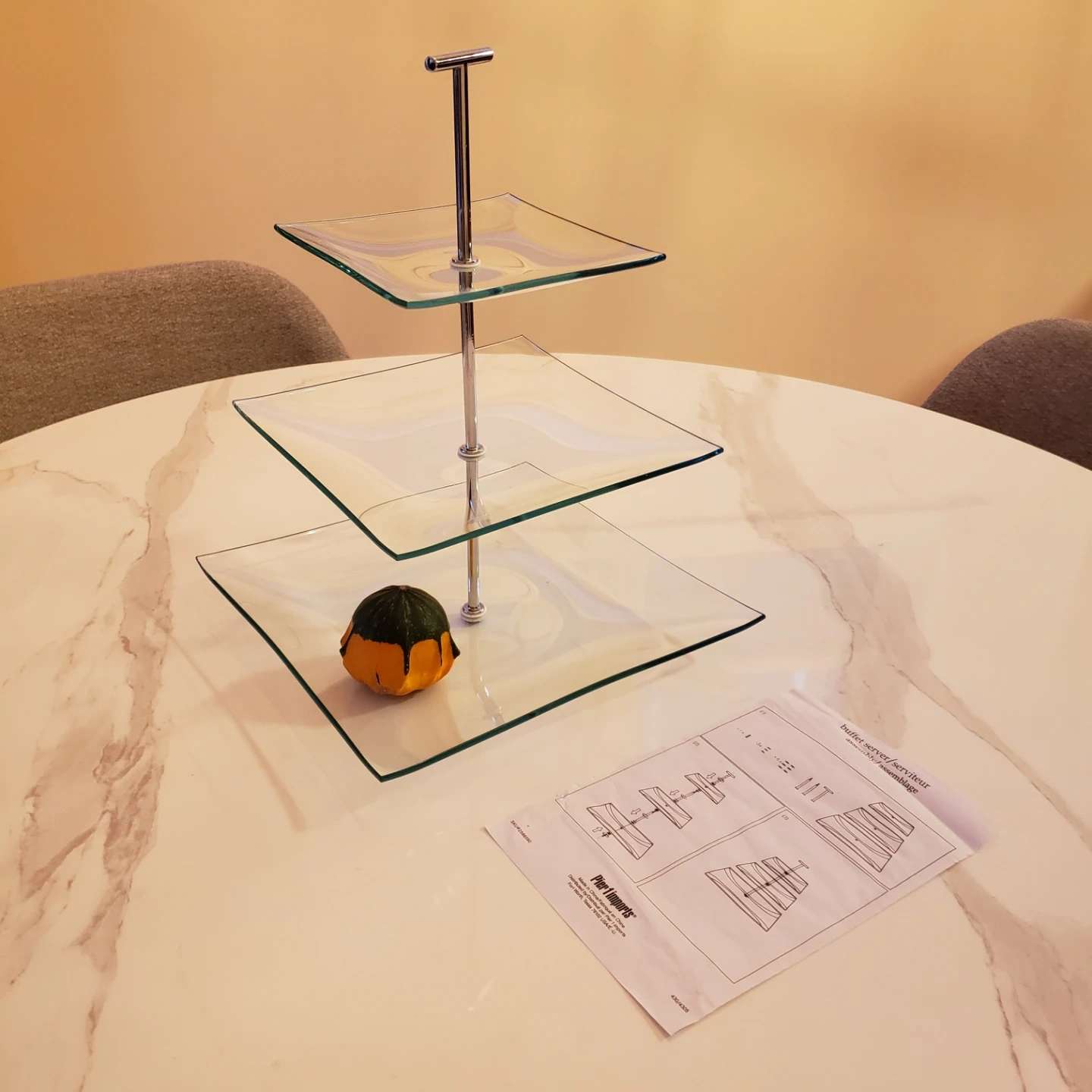 Three-tier glass server. Chrome stand. Simple assembly required. Elegant design. Perfect for parties or special occasions.