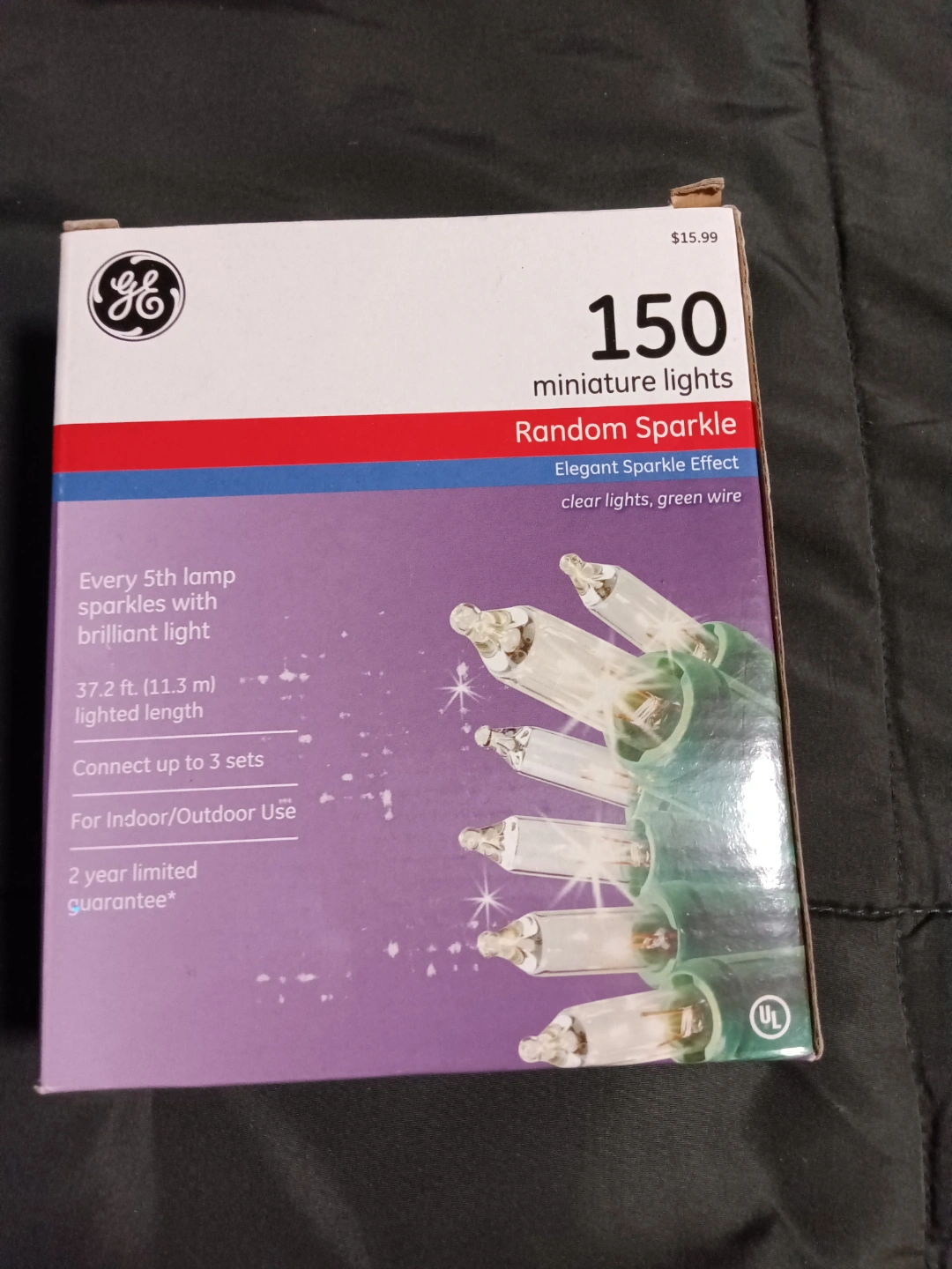 New in box. 150 miniature lights. Random sparkle effect. Clear lights, green wire. 37.2 ft (11.3 m) lighted length. Connects up to 3 sets. Indoor/outdoor use. Purchased, never used (as I moved several times & they were boxed all the while). The random sparkle effect in warm white looks great. I have other GE random effects light sets, snowflakes. Pickup only in Maspeth Queens.