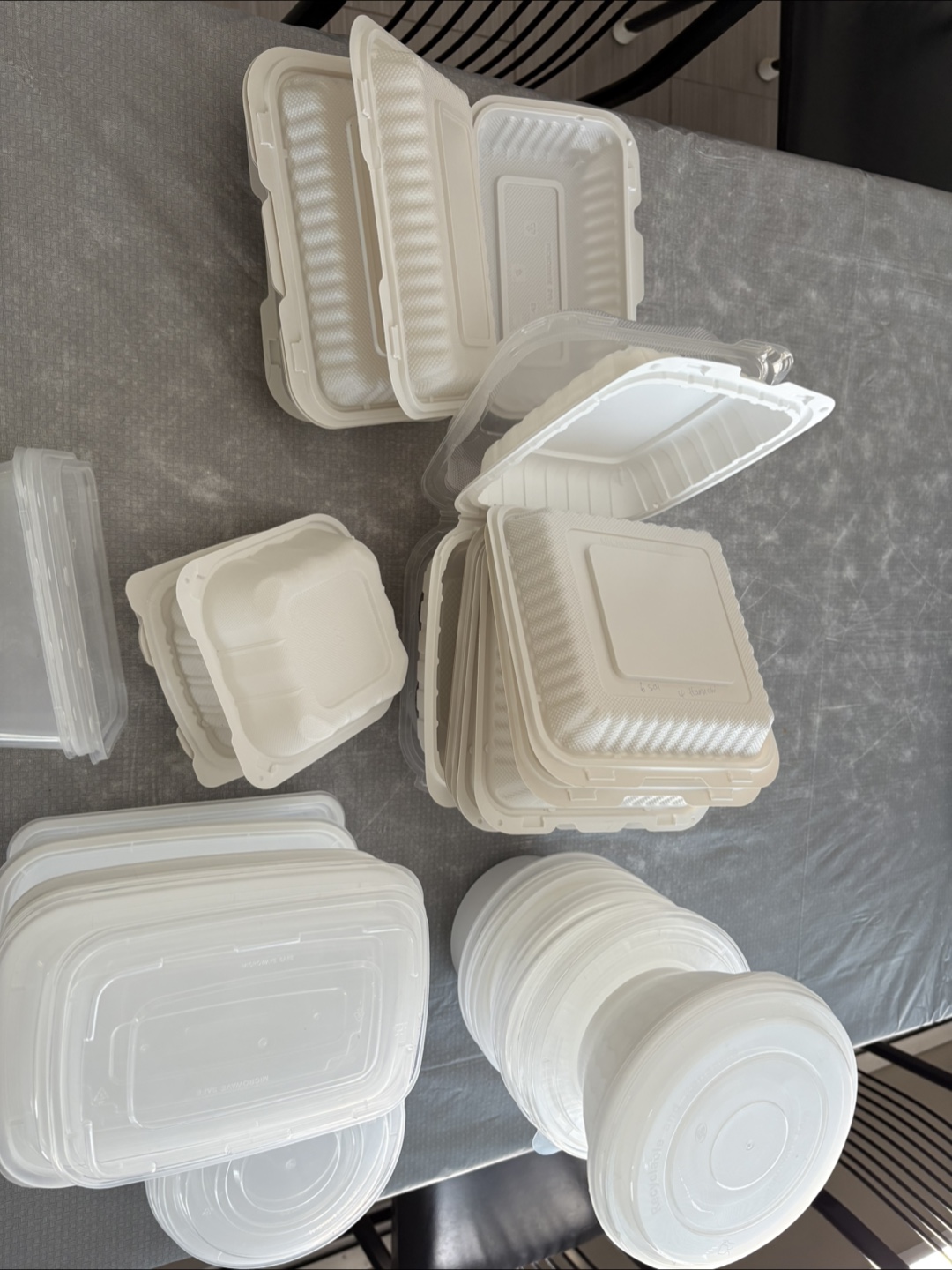 Various sizes and styles of plastic food containers. Ideal for restaurants or catering businesses. Includes hinged containers and stackable options.