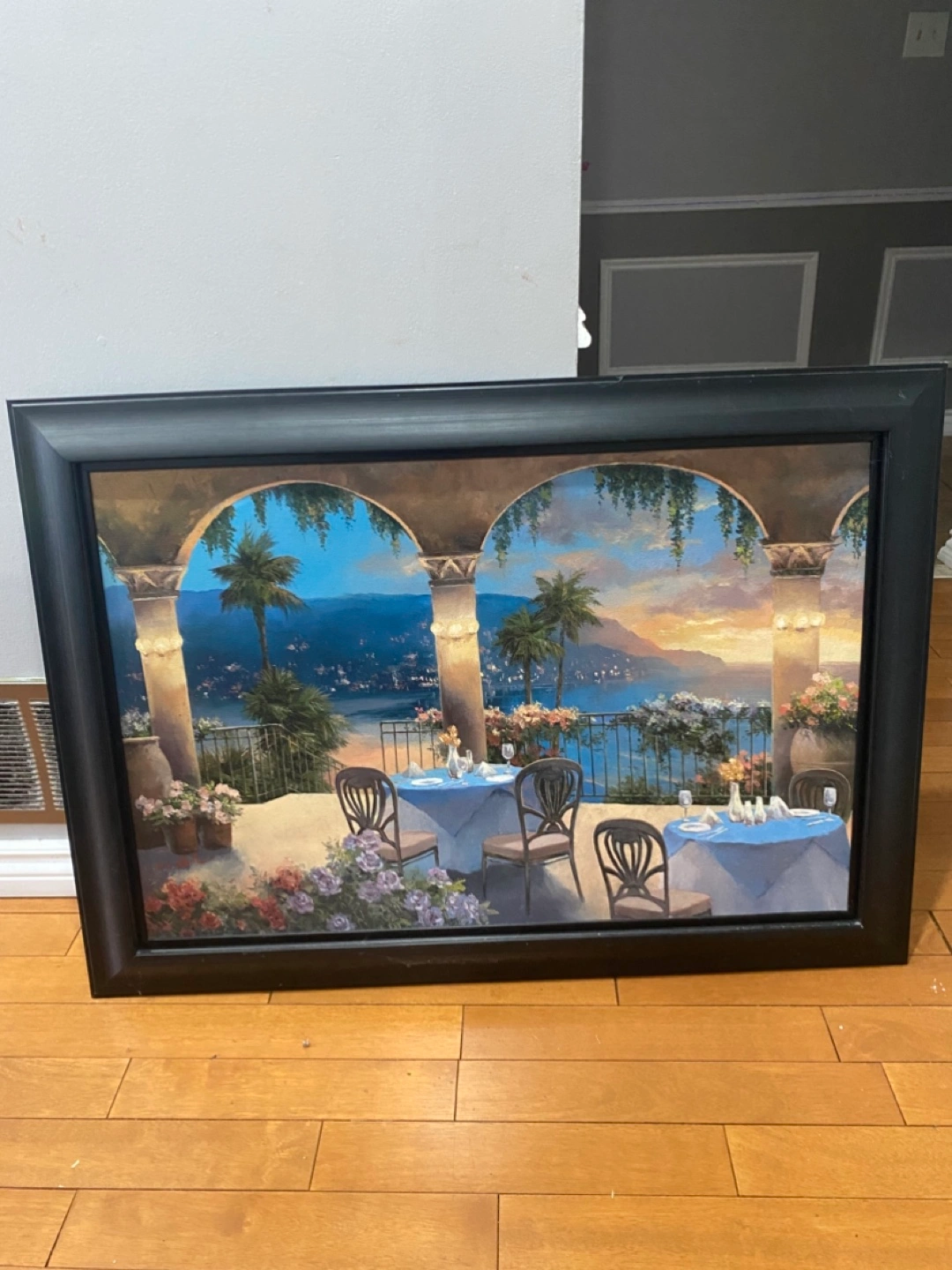 Large framed picture. Depicts a romantic seaside dinner setting at sunset. Black frame. Great for adding a touch of elegance to your home décor.