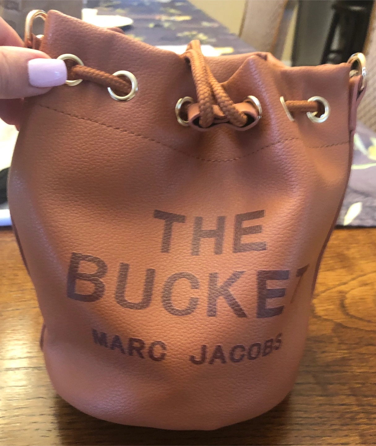 Tan leatherette bucket bag. Features drawstring closure and top handle. Comes with an adjustable and removable strap. Marc Jacobs branding on the front and inside. Gold toned hardware.