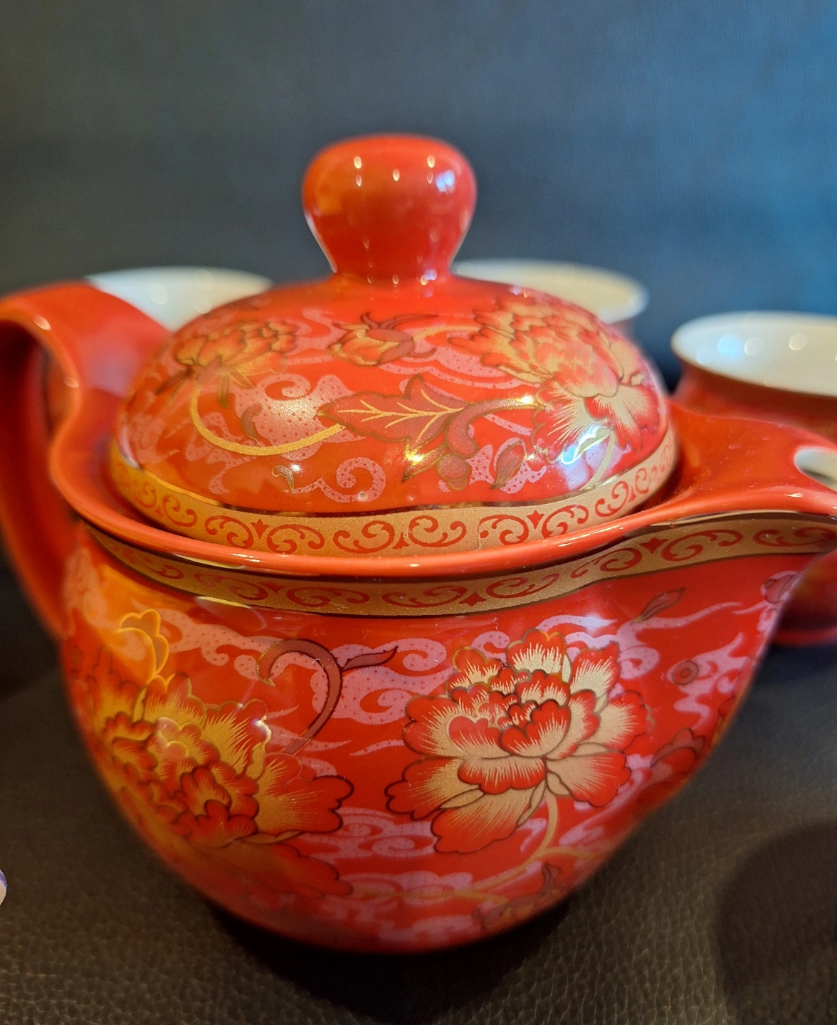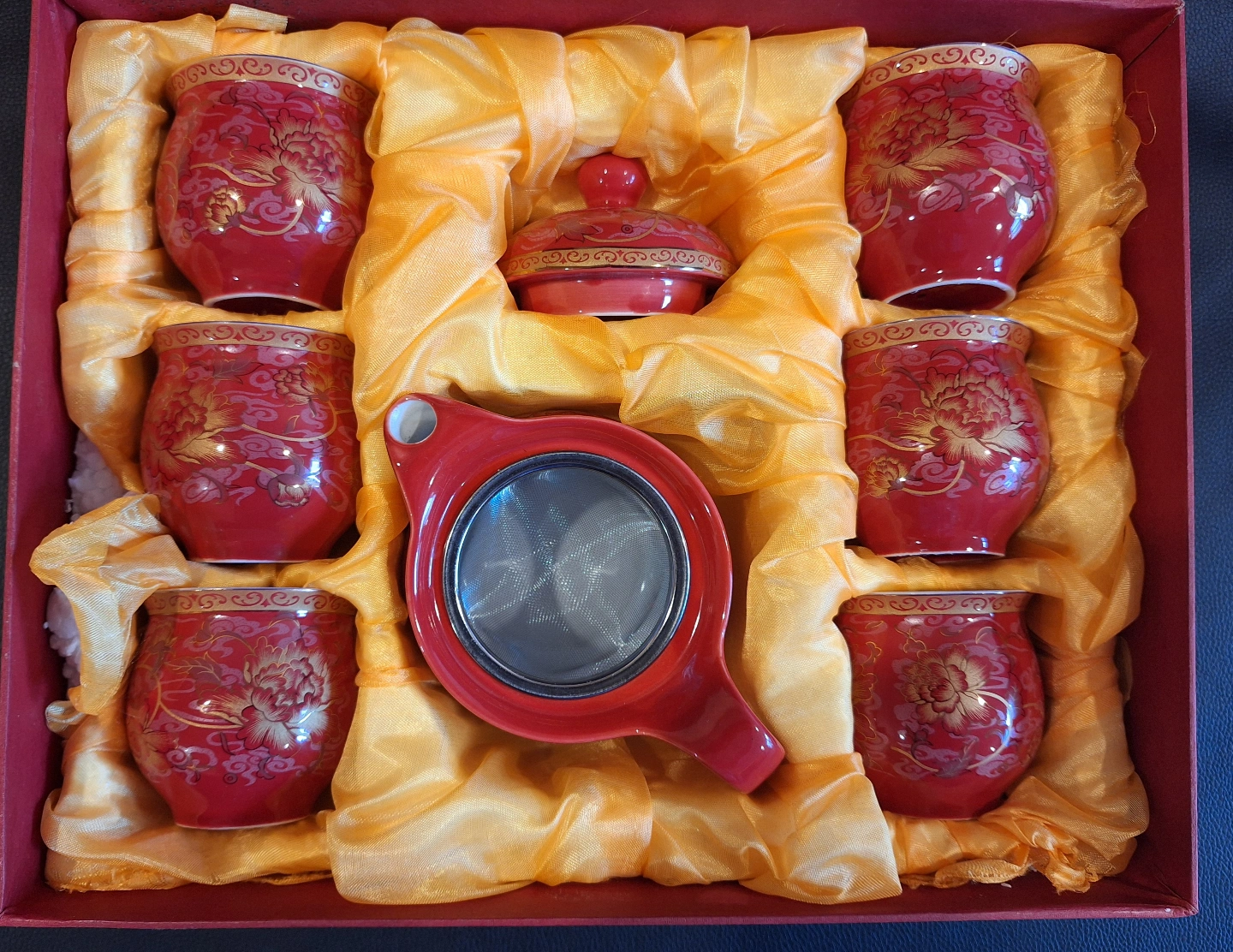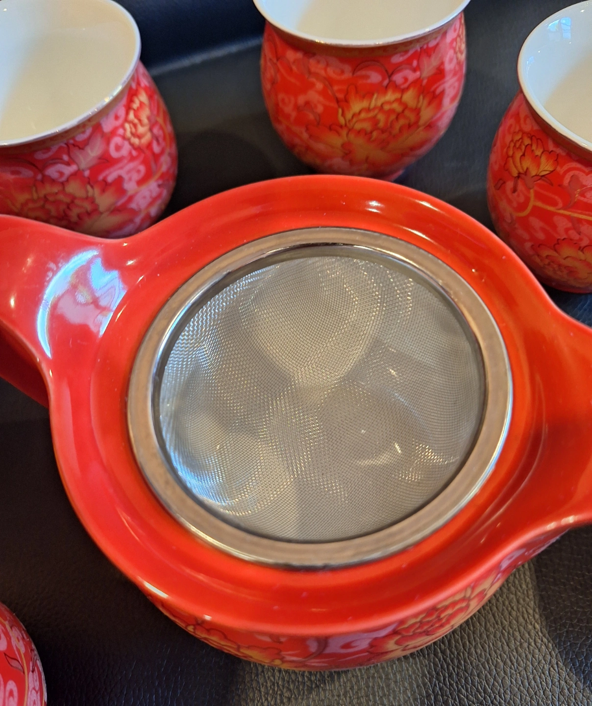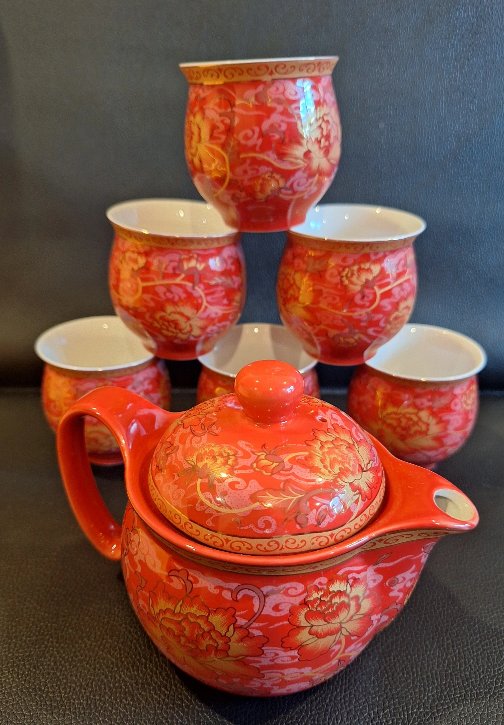 Beautiful red tea set. Features gold floral design. Includes teapot with infuser and six teacups. Comes in a box.