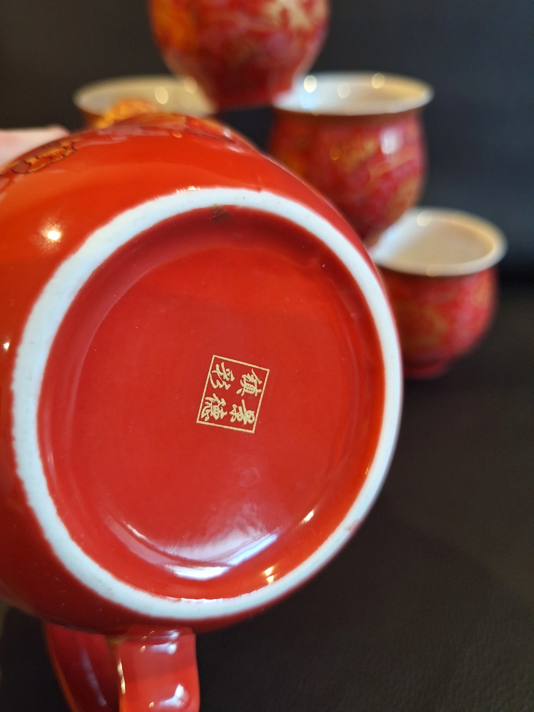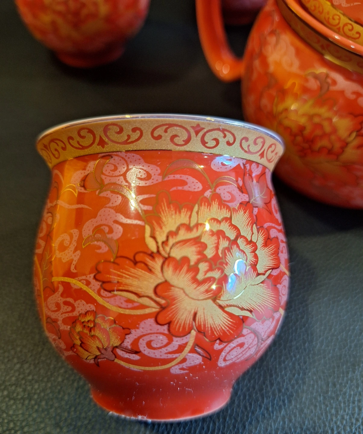 Red Chinese Tea Set with 6 cups and pot, double walls