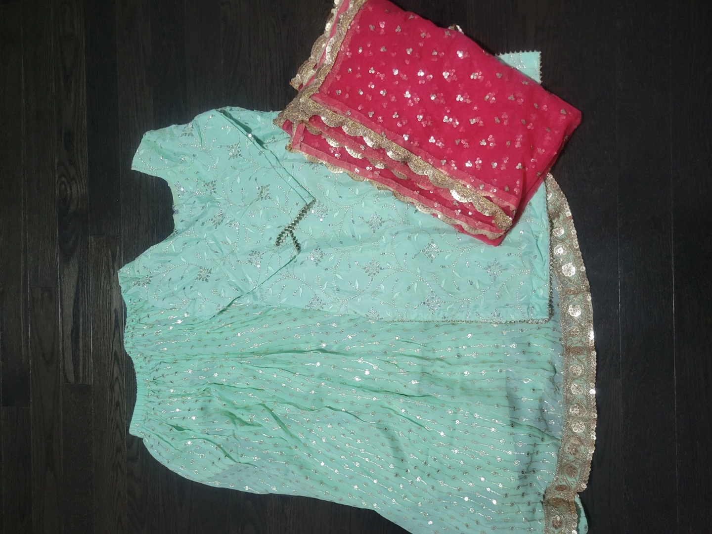 10Beautiful mint green and hot pink two-piece suit set. Features delicate sequin embroidery throughout and gold embellishments. Includes a long skirt and dupatta.