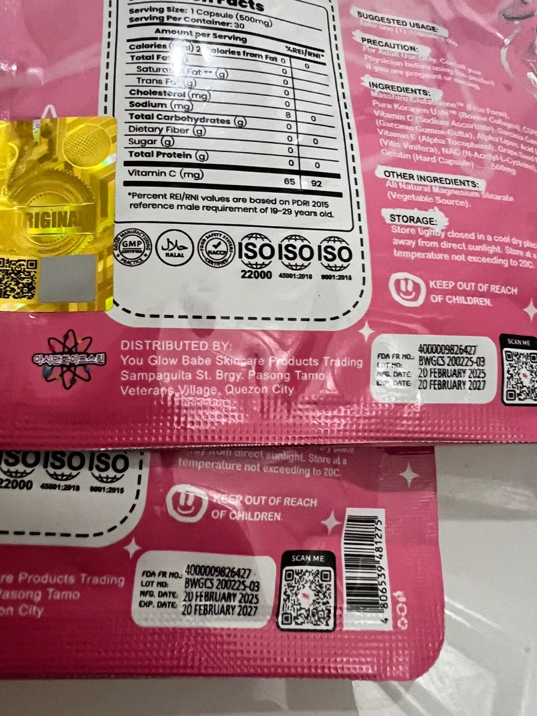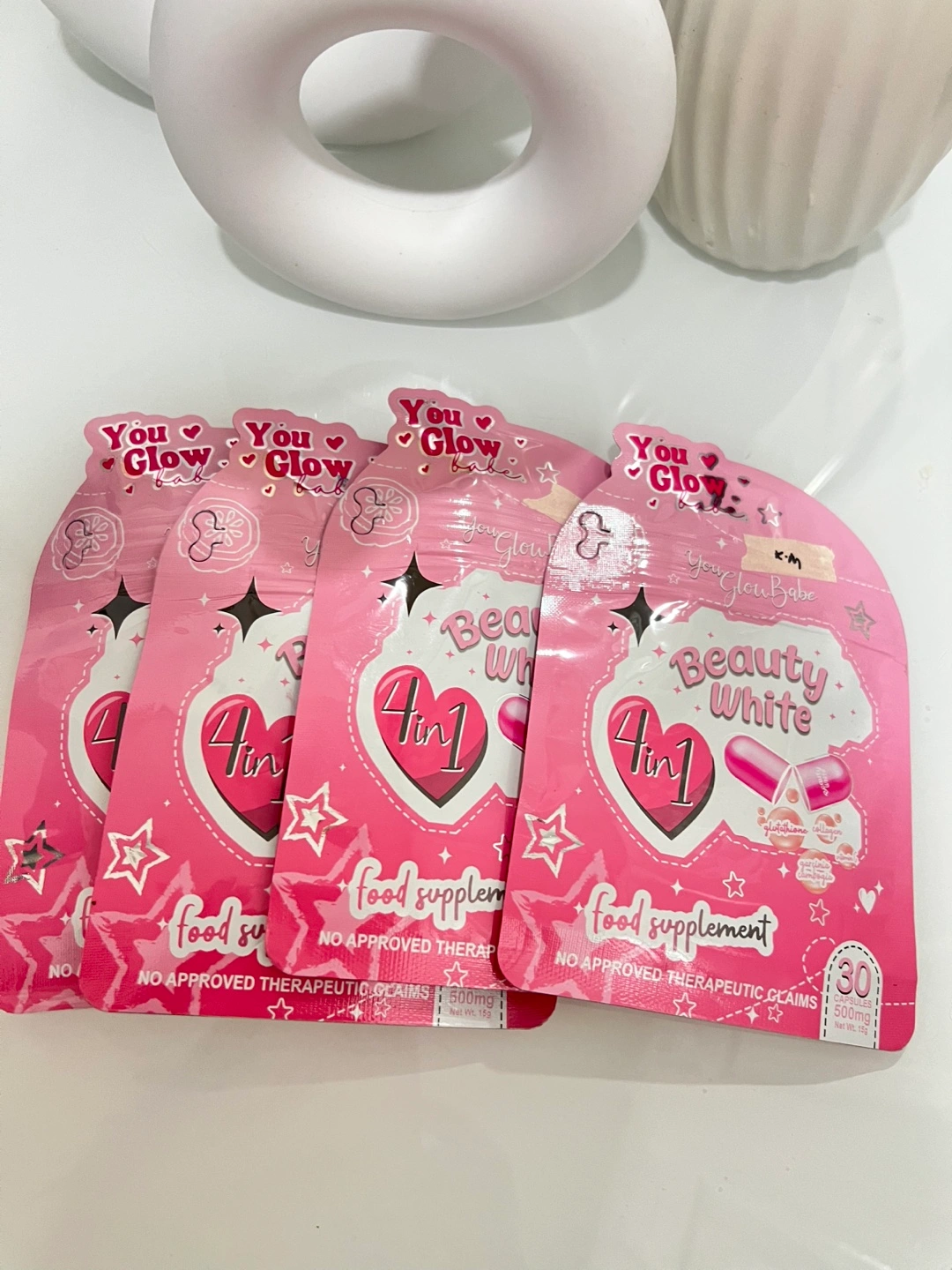 Four packets of You Glow Babe Beauty White 4 in 1 food supplement. 30 capsules per packet. 500mg per serving. Dietary supplement