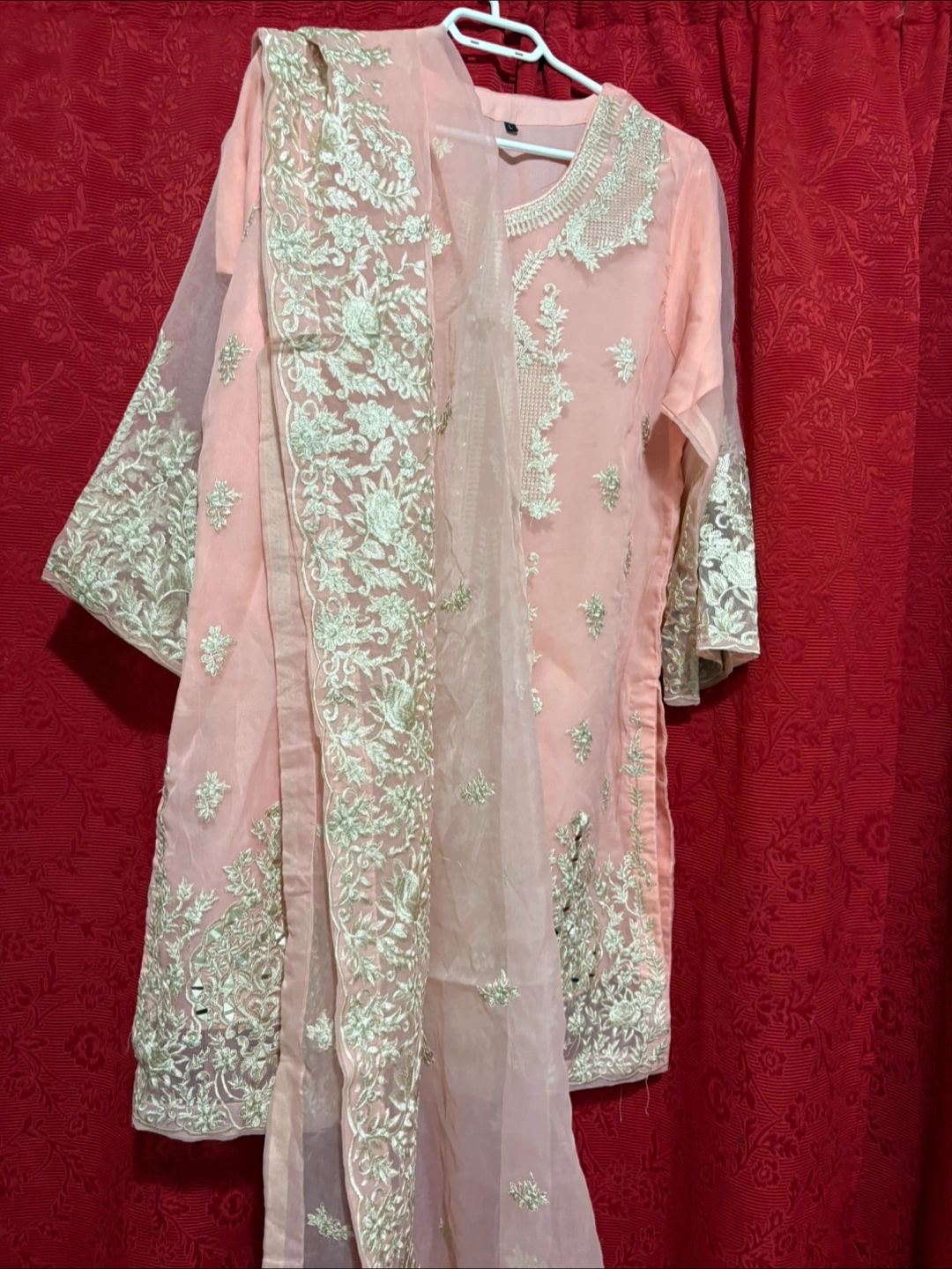Gorgeous embroidered shalwar kameez sets. Peach set features delicate silver embroidery. Off-white set has silver, teal and burgundy embroidery. Includes kameez, shalwar, and dupatta. Three-quarter sleeves. Elegant and stylish.( each for 55 ) pick and cash only