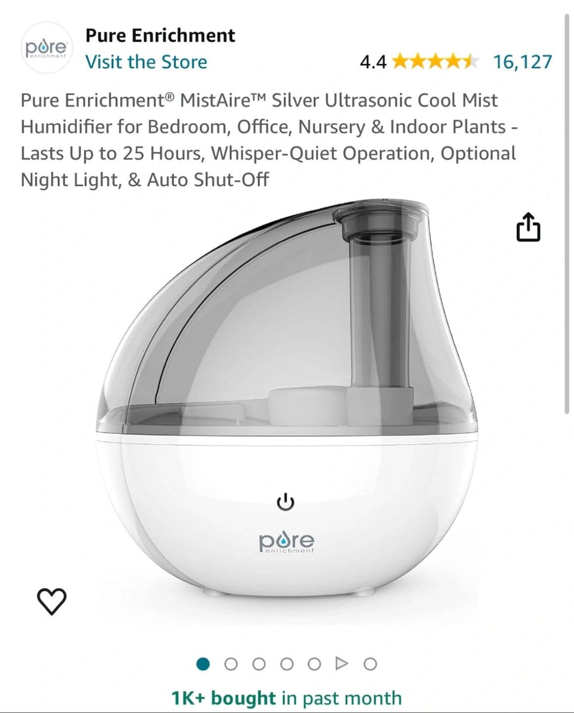 Pure Enrichment® MistAire™ Silver Ultrasonic Cool Mist Humidifier for Bedroom, Office, Nursery & Indoor Plants