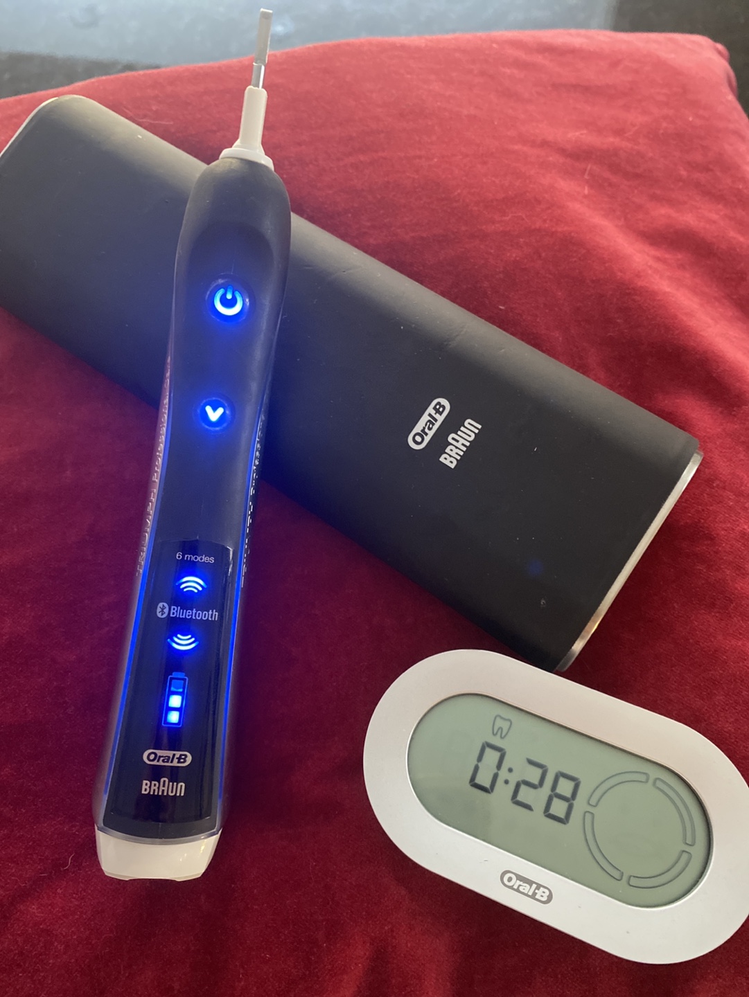 Braun Oral-B, triumph professional care Bluetooth toothbrush, with six modes (new in-store, 160 CAD ex), including 7 separately packaged brush heads. As new, yet cleaned hygienically thoroughly. Type 3757, 110-130V, rechargeable power, electric toothbrush, with seven replacement brush heads, Bluetooth, connectivity and travel case, black, powered, with timer and charger.