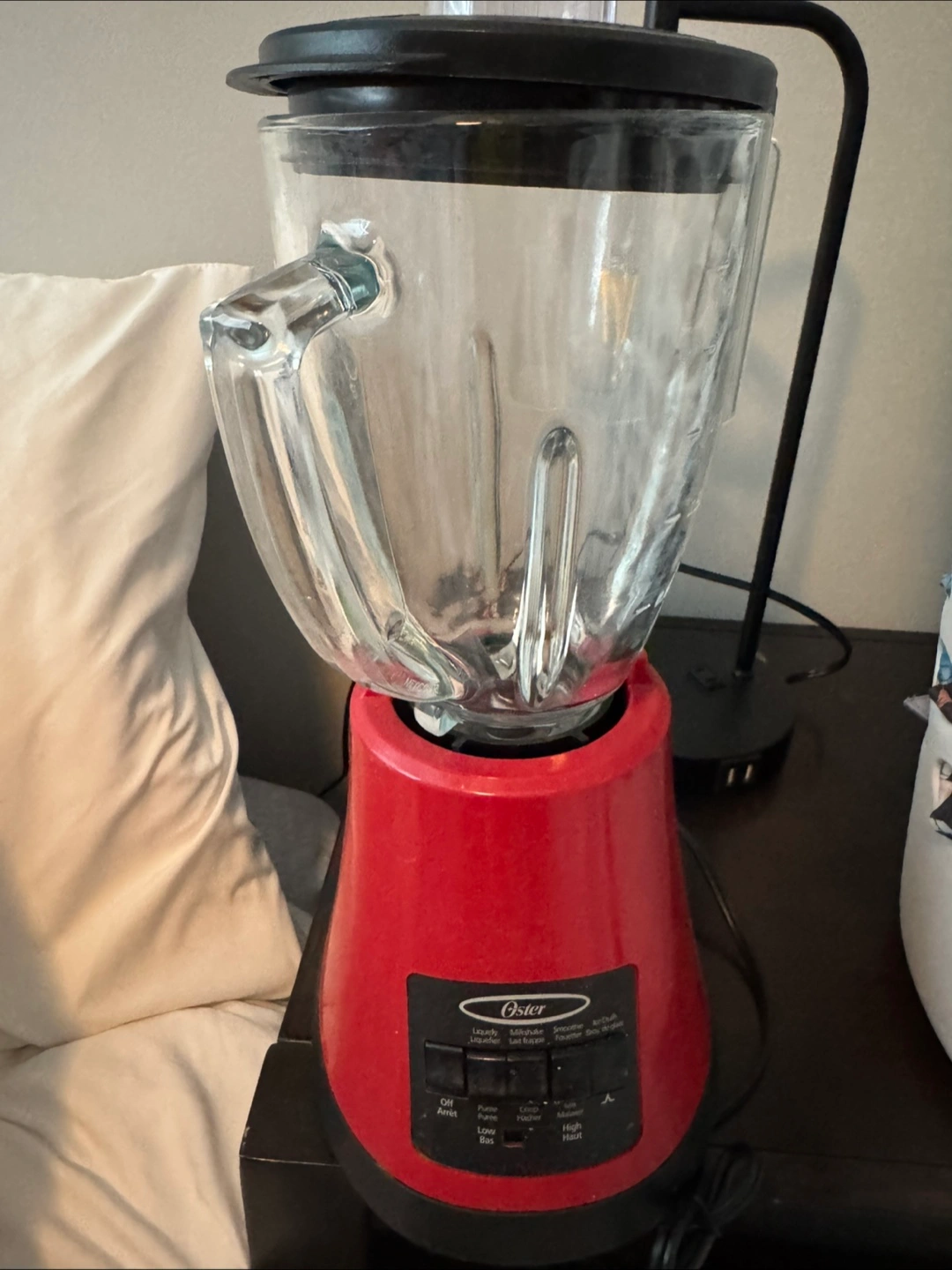 Red Oster blender. Glass jar. Multiple speed settings. Includes various functions: liquefy, milkshake, smoothie, ice crush, purée, chop, and mix.