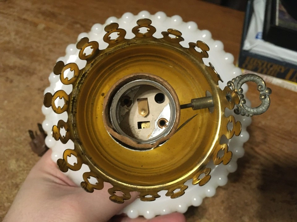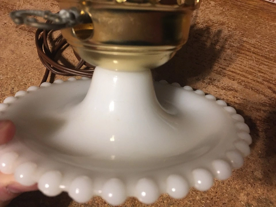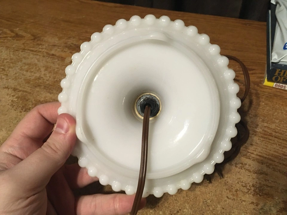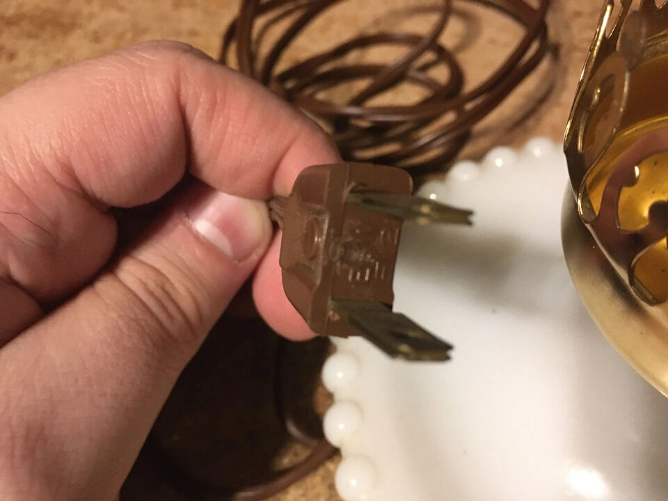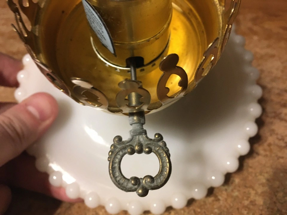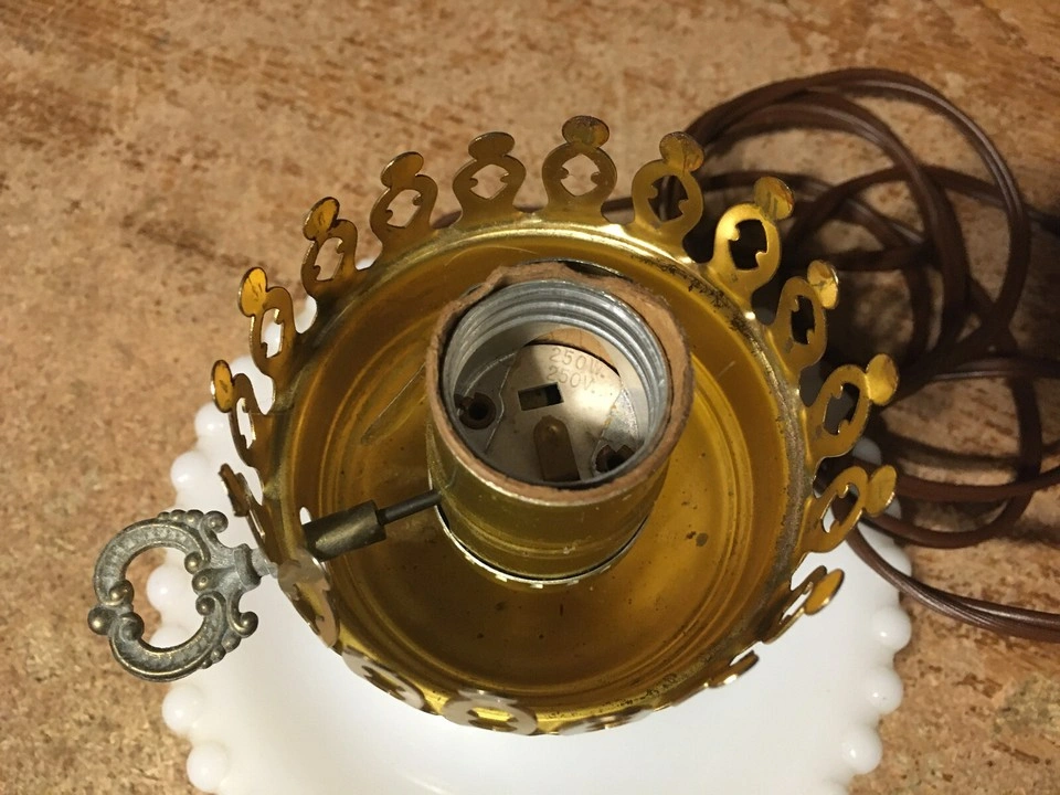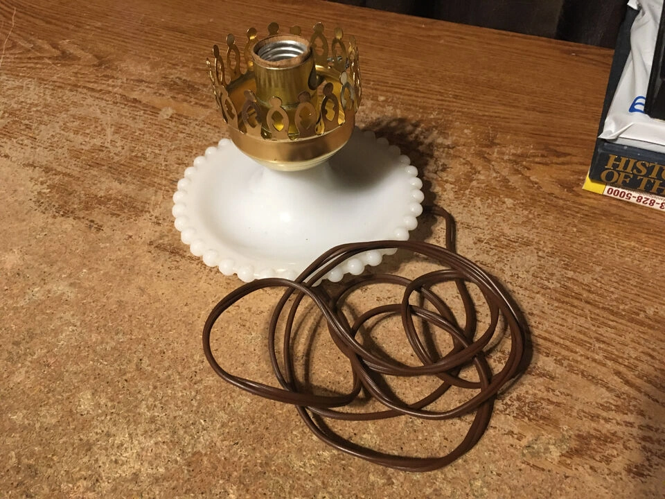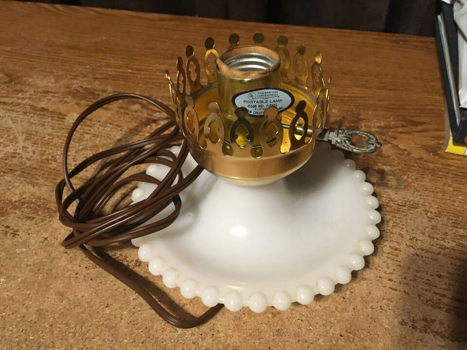 Adorable vintage lamp. Features a milk glass base and brass accents. Includes a brown electrical cord. Works with a standard bulb. pick up at house