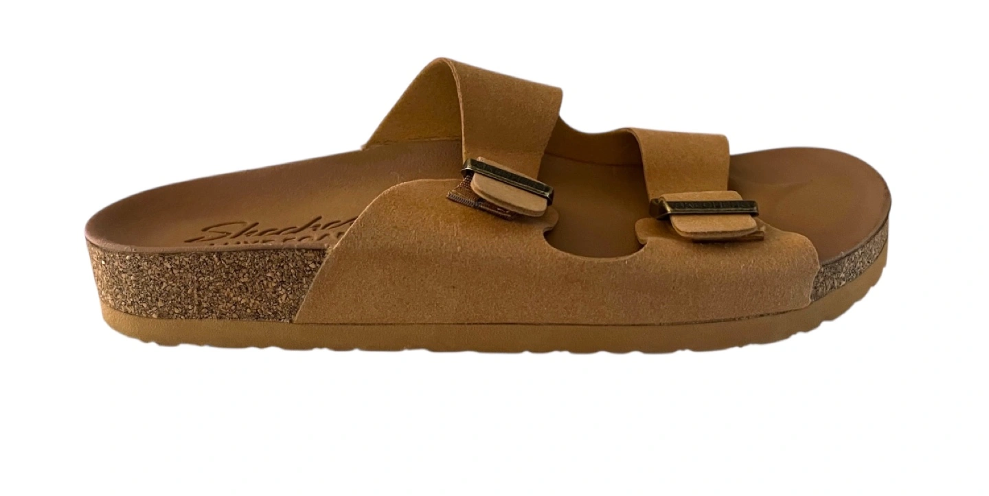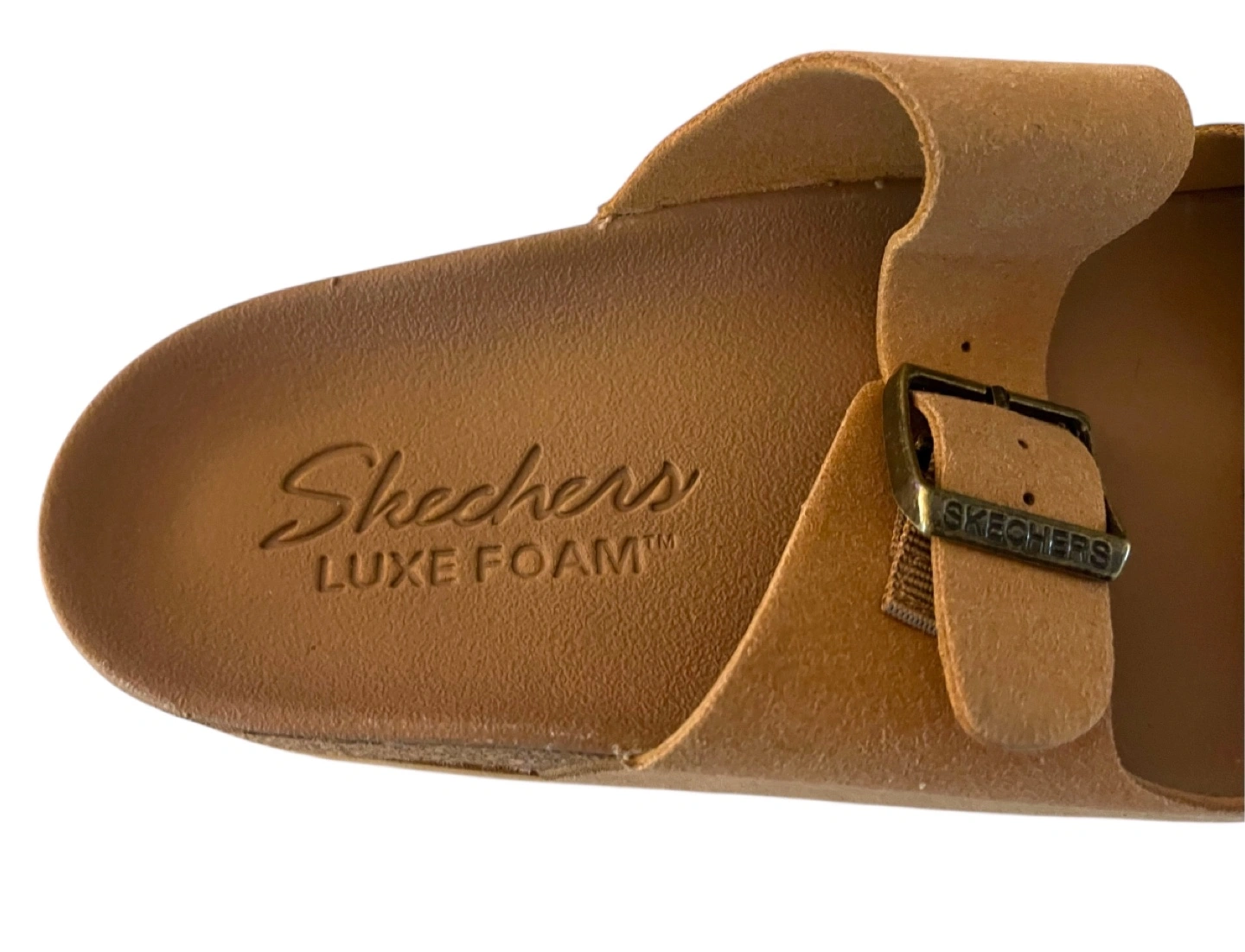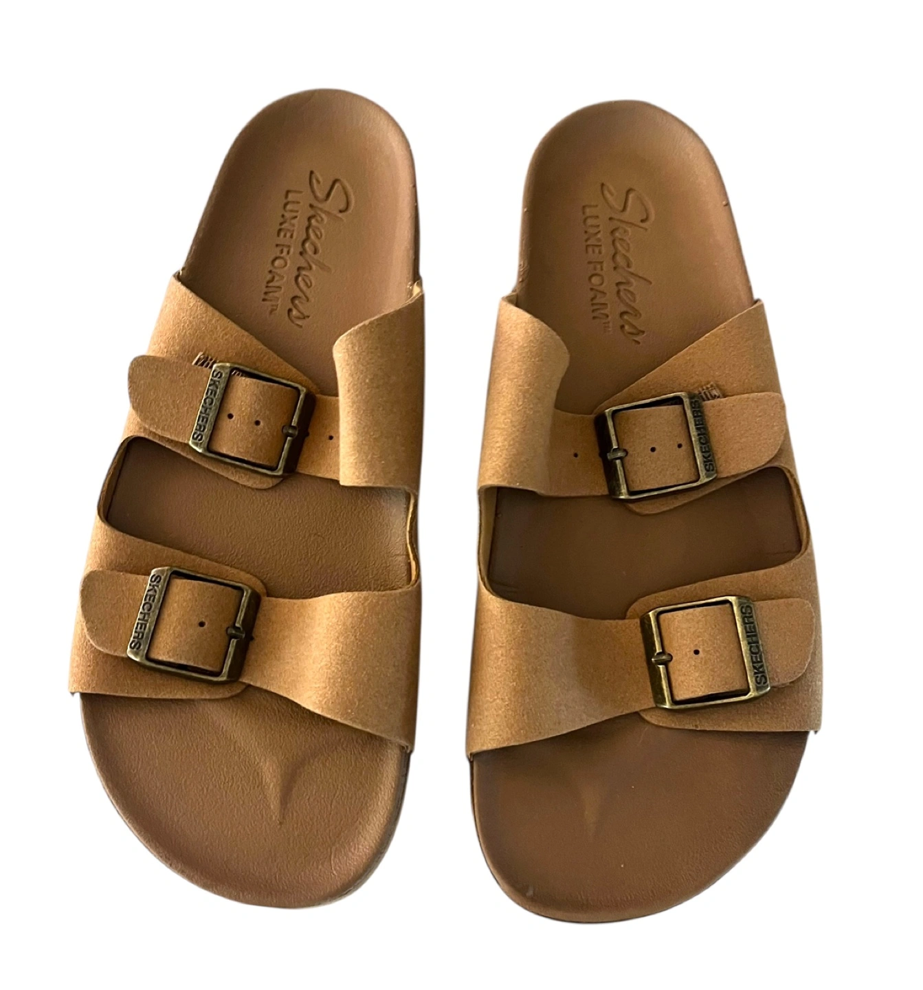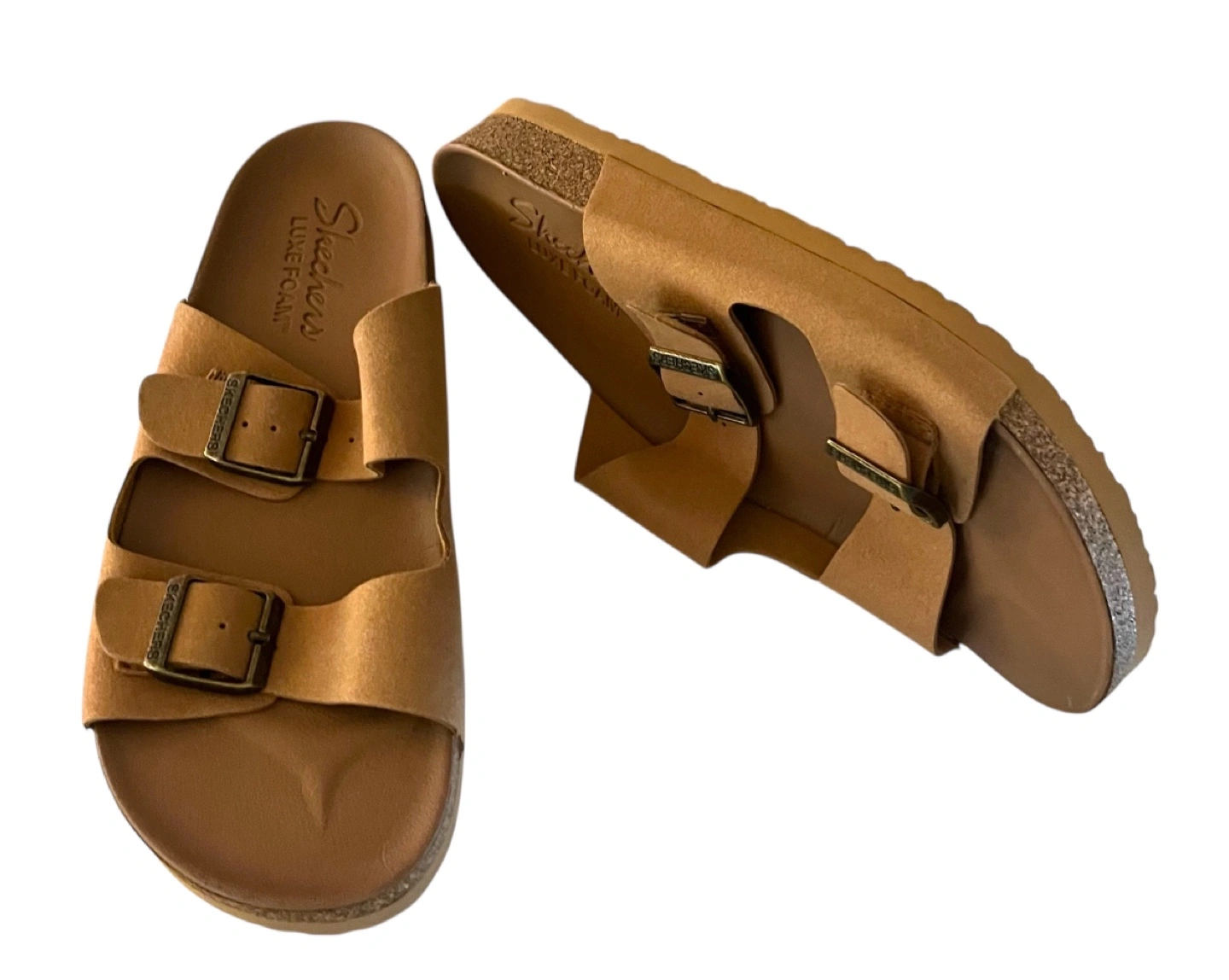 Keywords: Skechers, Luxe Foam, Sandals, Slides, Adjustable Straps, Buckle, Comfort, Casual, Women's Shoes, Brown Sandals, Slip On, Summer Shoes