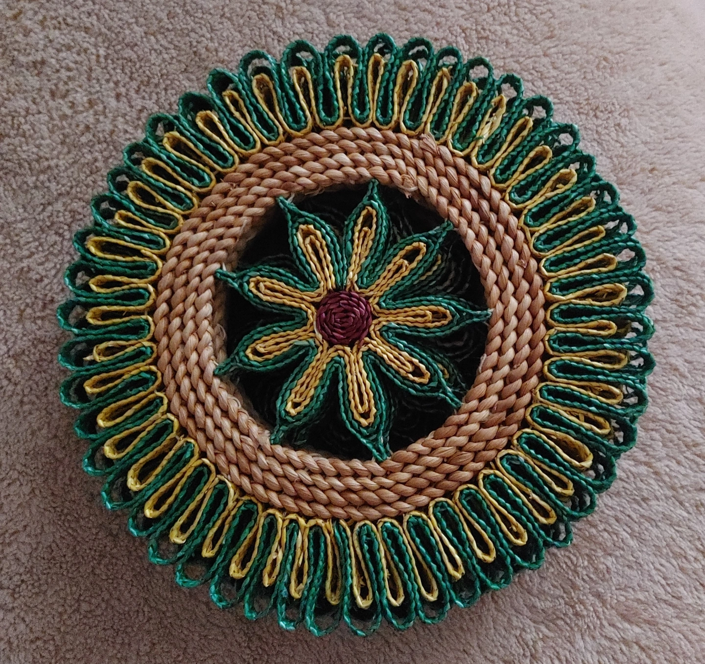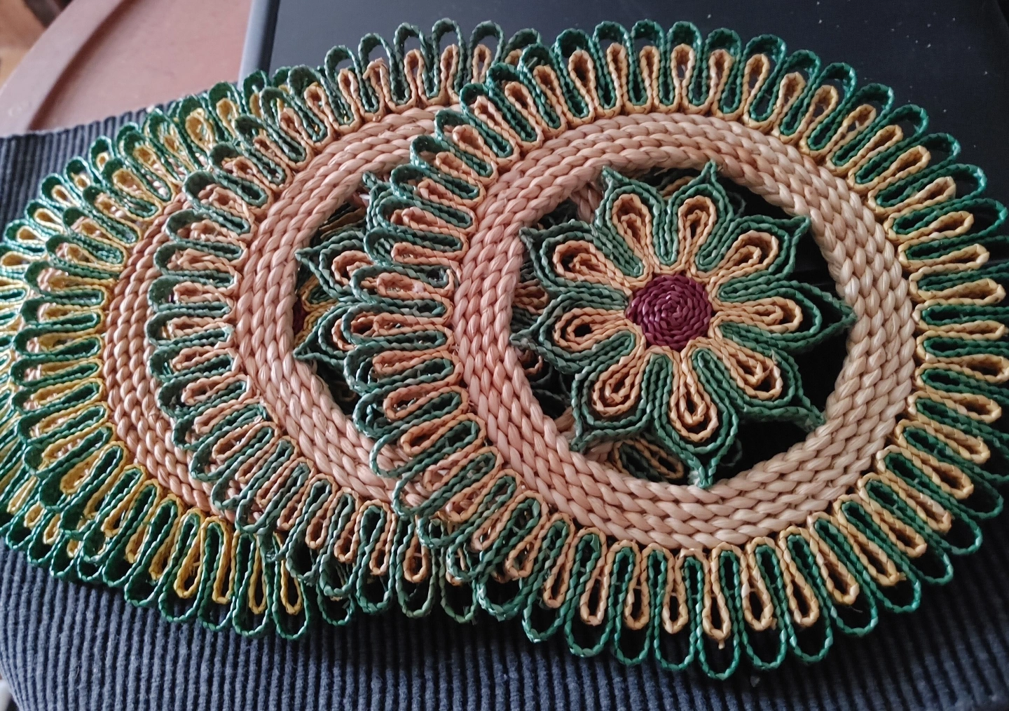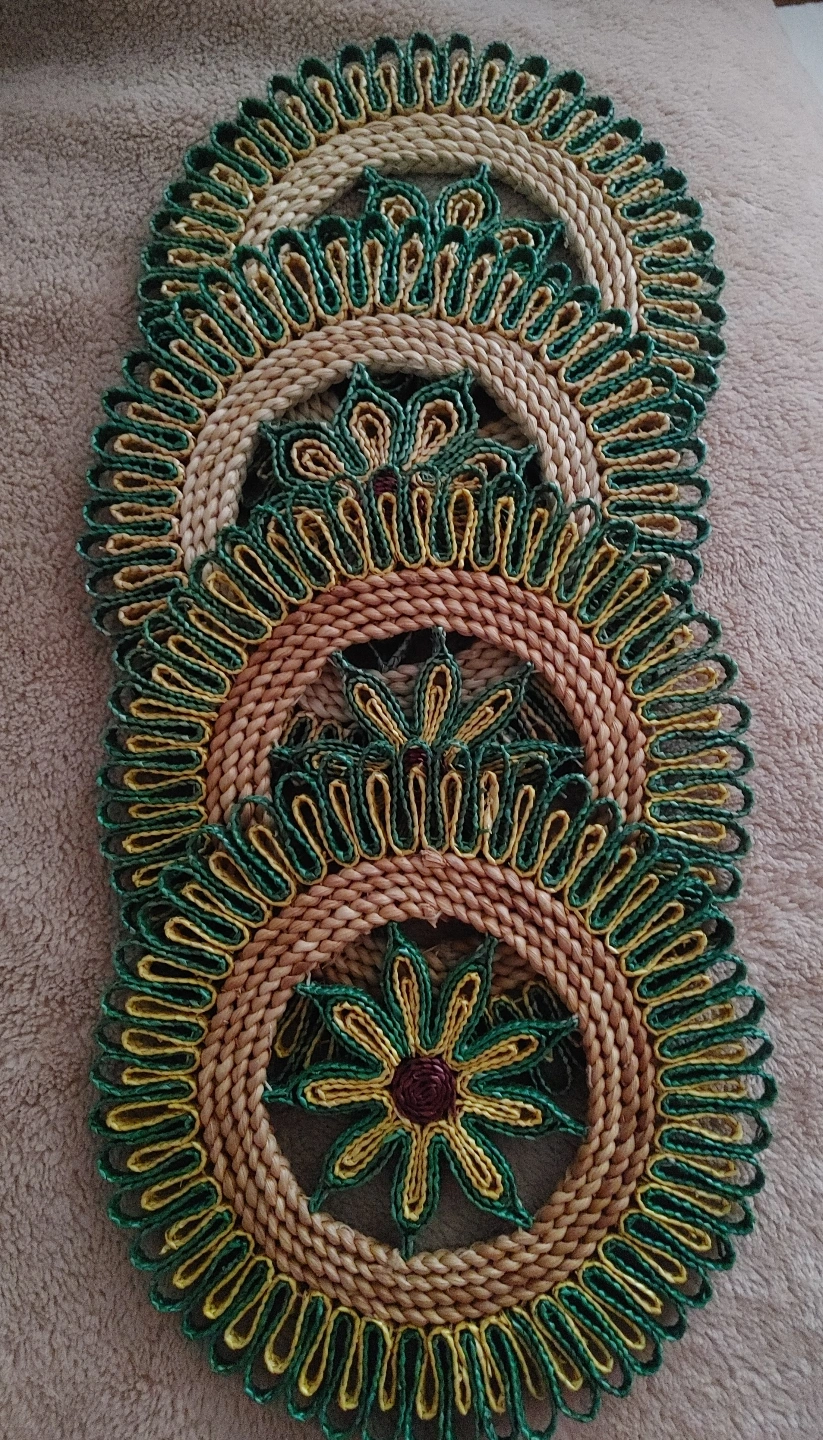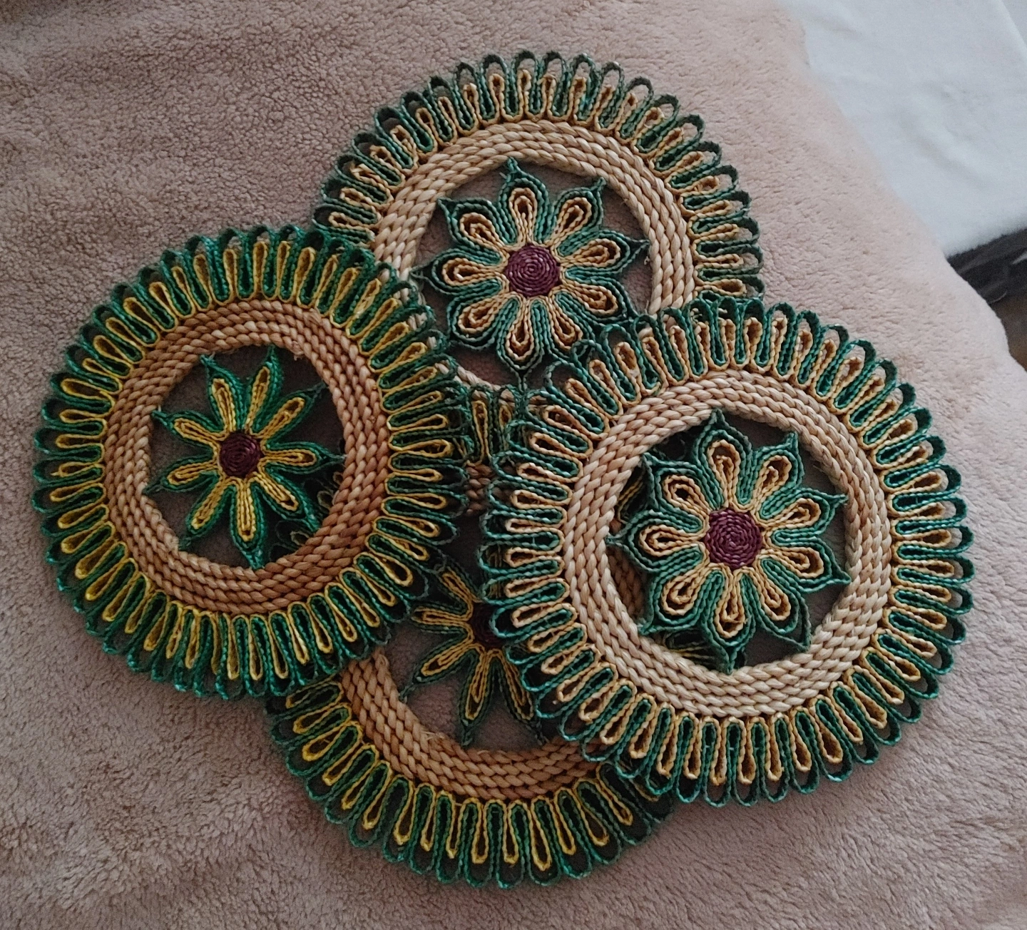 Add a touch of bohemian charm to your kitchen with this set of four, vintage straw trivets. These hot pads are made of woven rattan and raffia. They are perfect for protecting your countertops and table surfaces from hot dishes.