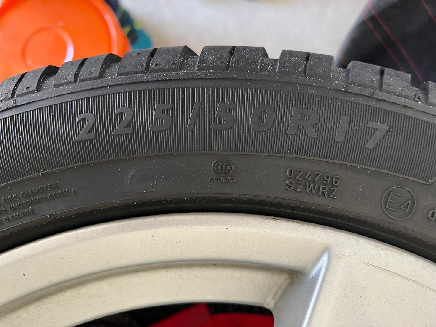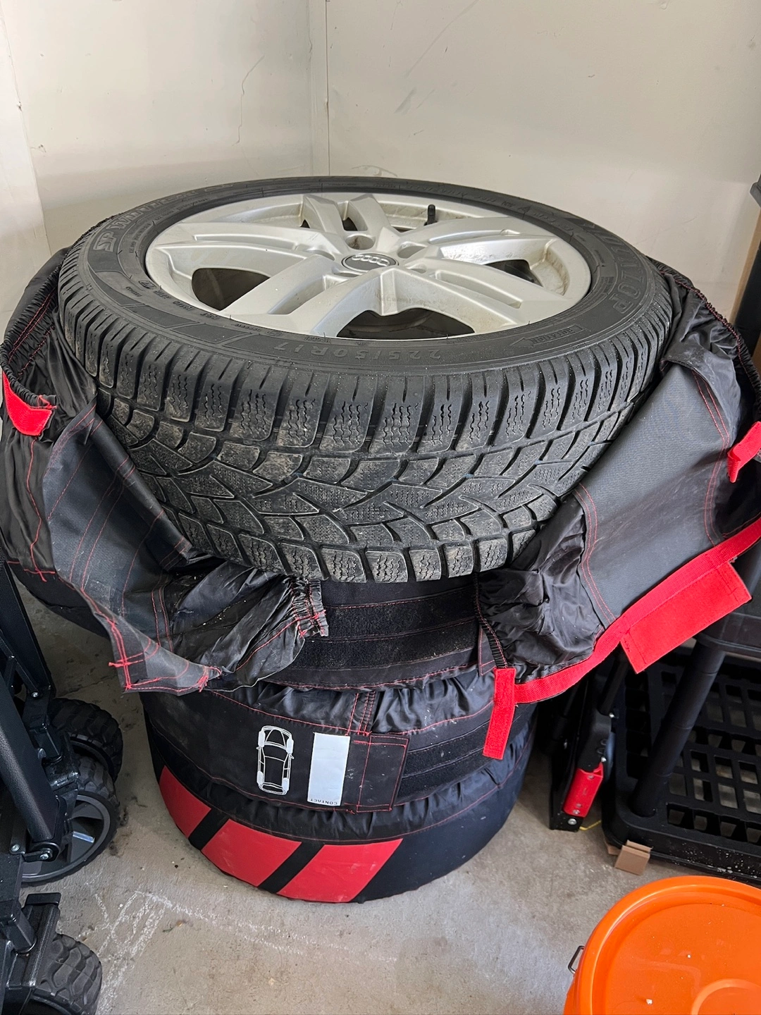 Set of four winter tires mounted on Audi A4 rims. Size 225/50R17. Stored in protective covers. Good condition.