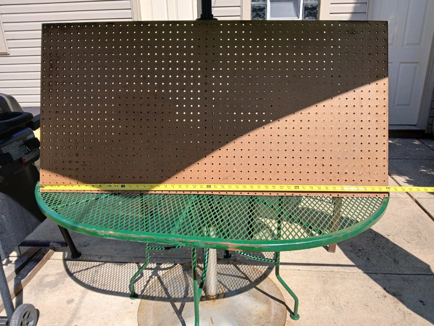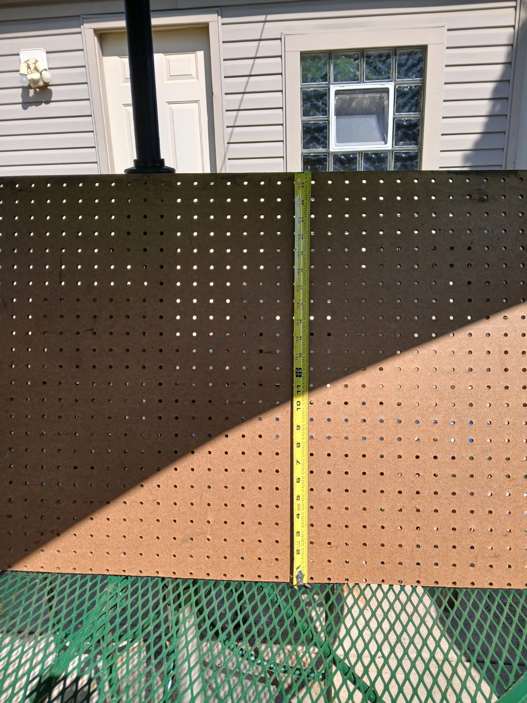 Unused pegboard, great for organizing crafts, tools, or other small items. Brown particleboard. Perfect for a garage, workshop, or craft room.