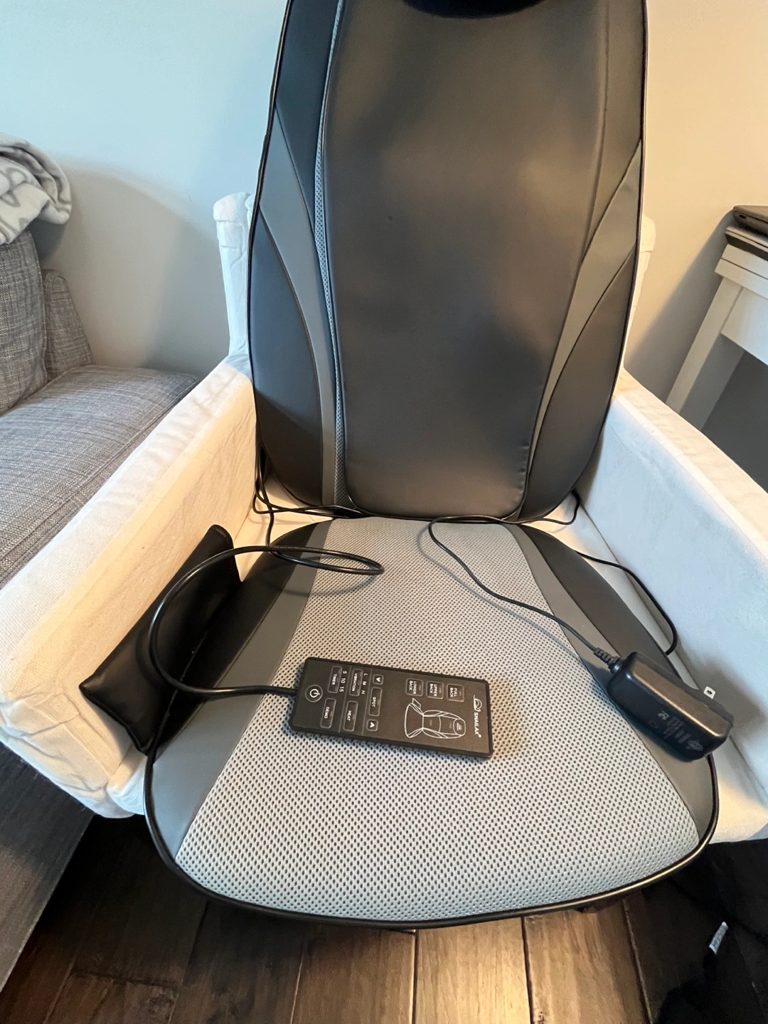 Back massage chair. Features a headrest. Made with breathable mesh. Would be perfect for winding down at the end of a long day.