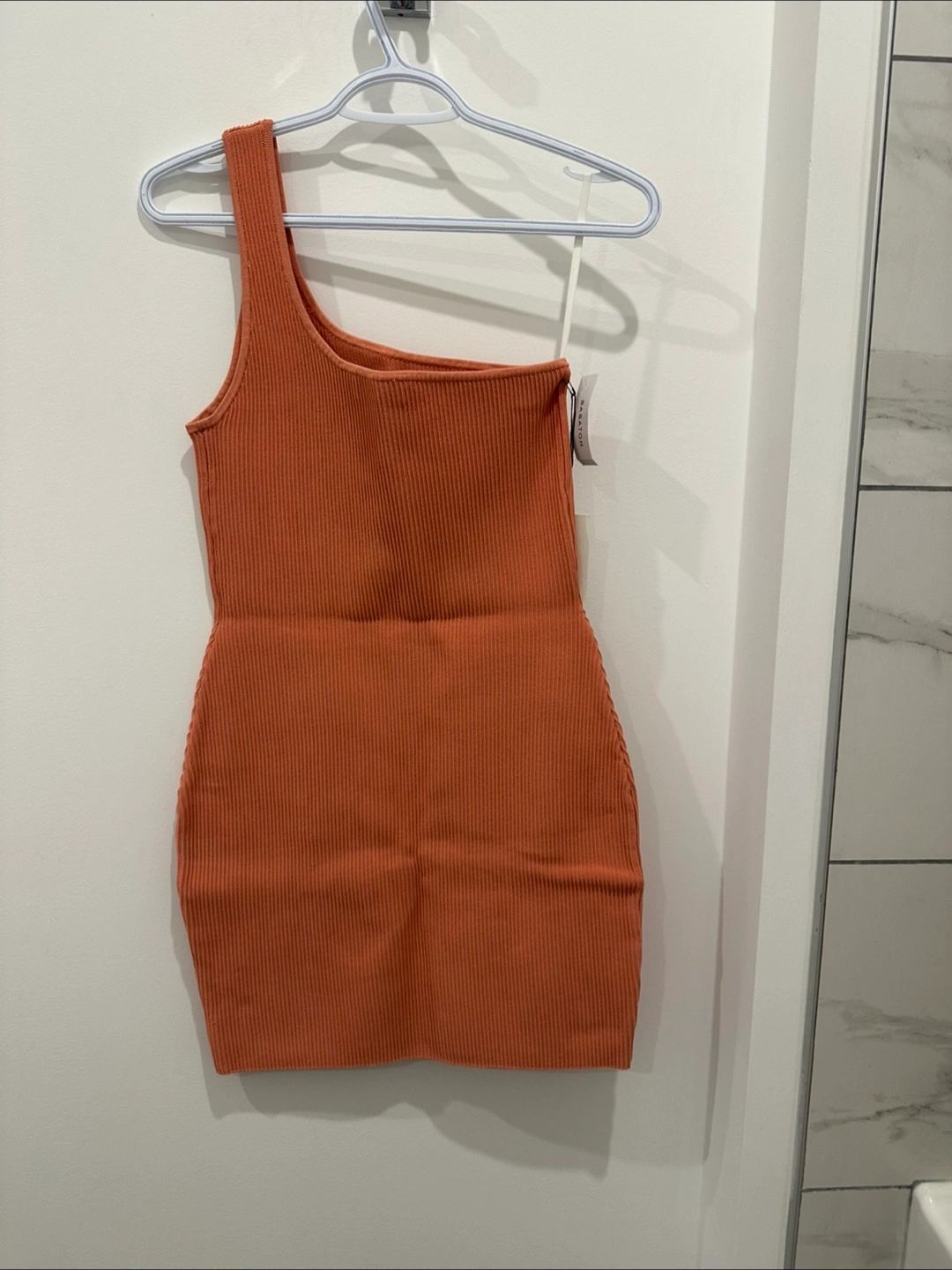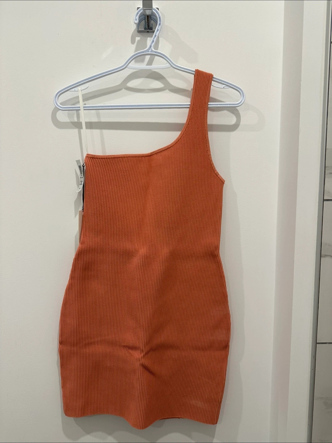 One shoulder dress. Features a ribbed texture. Comes in an grapefruit coral color. Perfect for a stroll on a summer day or a party. Originally purchased it for my graduation, but I found a different dress.