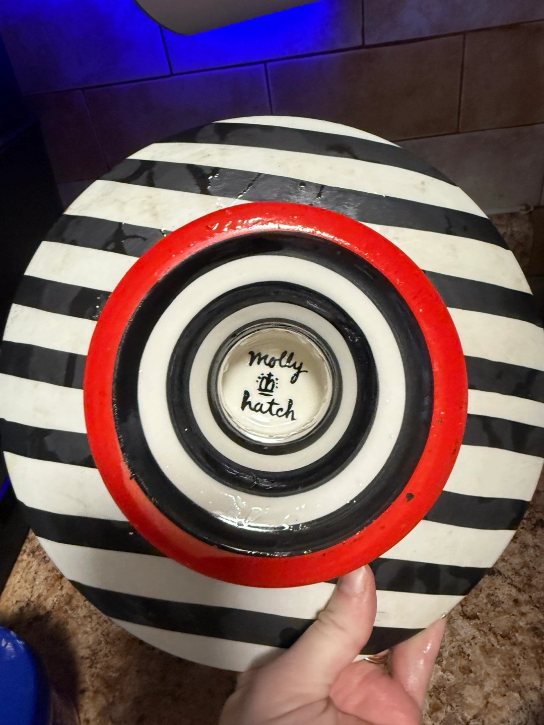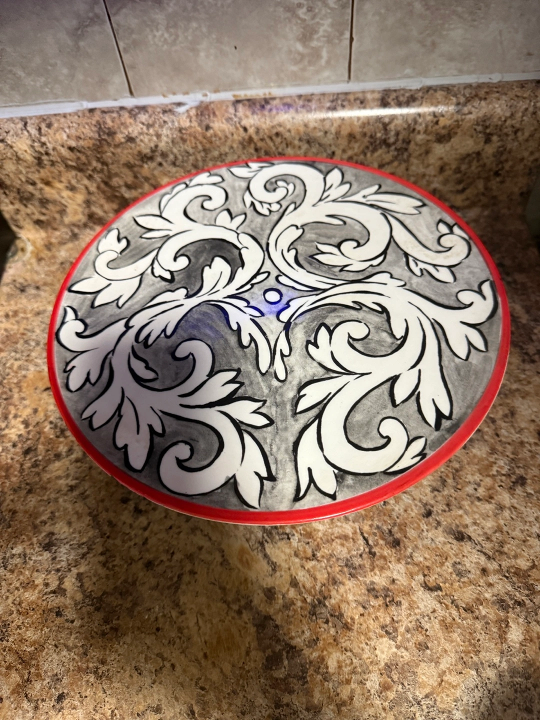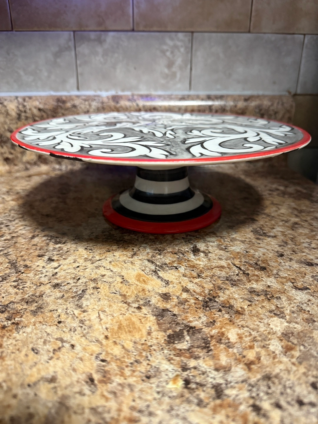 Round cake stand. Features a red rim. Top surface decorated with a gray and white pattern. Stand has stripes. It could be a nice addition to a special gathering.
